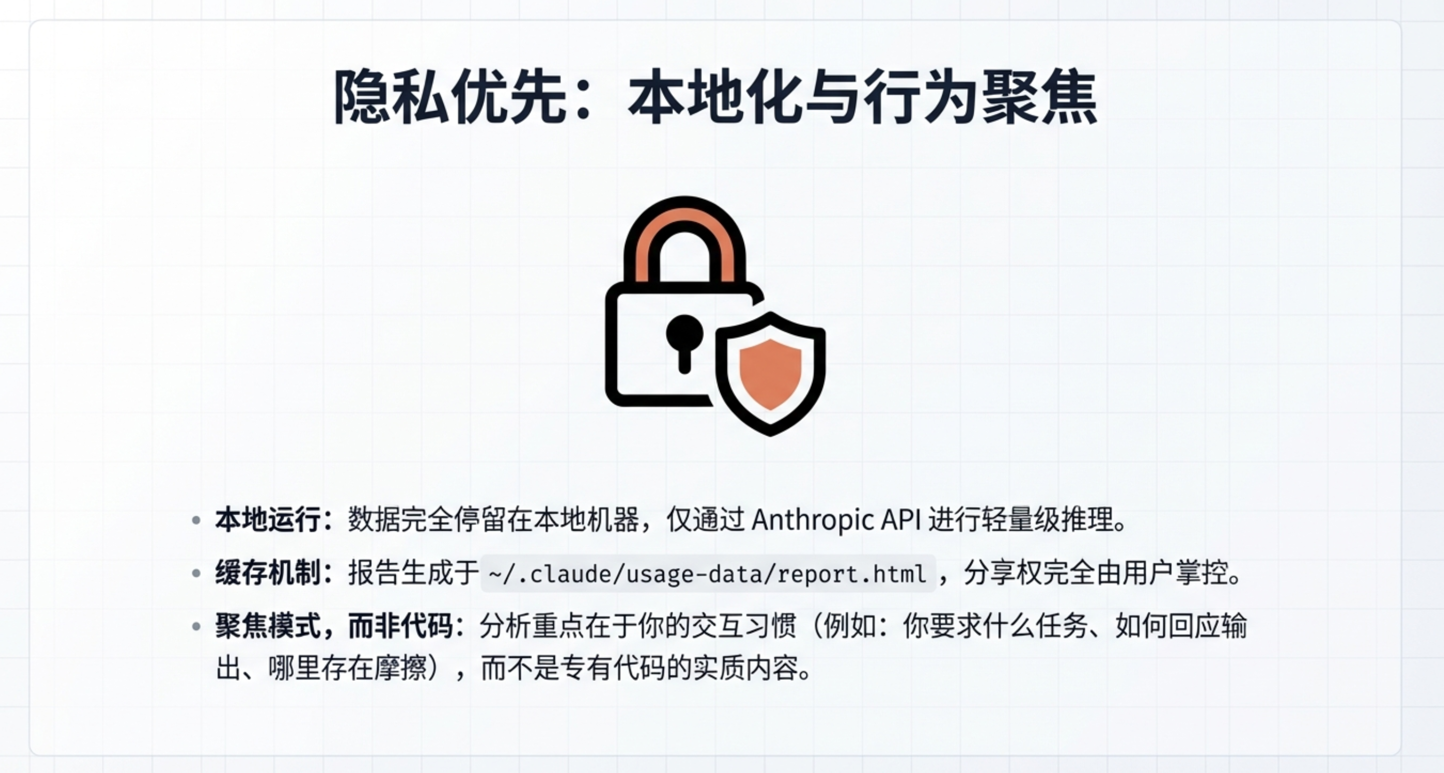 /insights的运行消耗了其5小时 API 限额的30%。建议在非高峰时段或对成本有预期的情况下使用。 - 隐私与本地化:虽然分析过程需要调用 Anthropic 的 API,但原始会话数据和生成的 HTML 报告都存储在用户本地机器上。你拥有对自己数据的所有权。