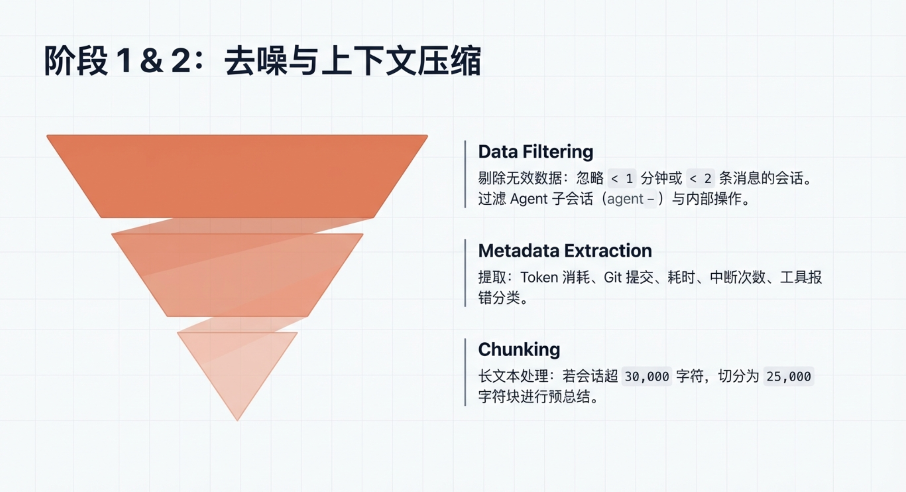 - 数据收集与过滤:系统从本地目录收集会话日志,并自动过滤掉少于2条消息、短于1分钟或属于内部操作的会话,确保分析的样本质量。