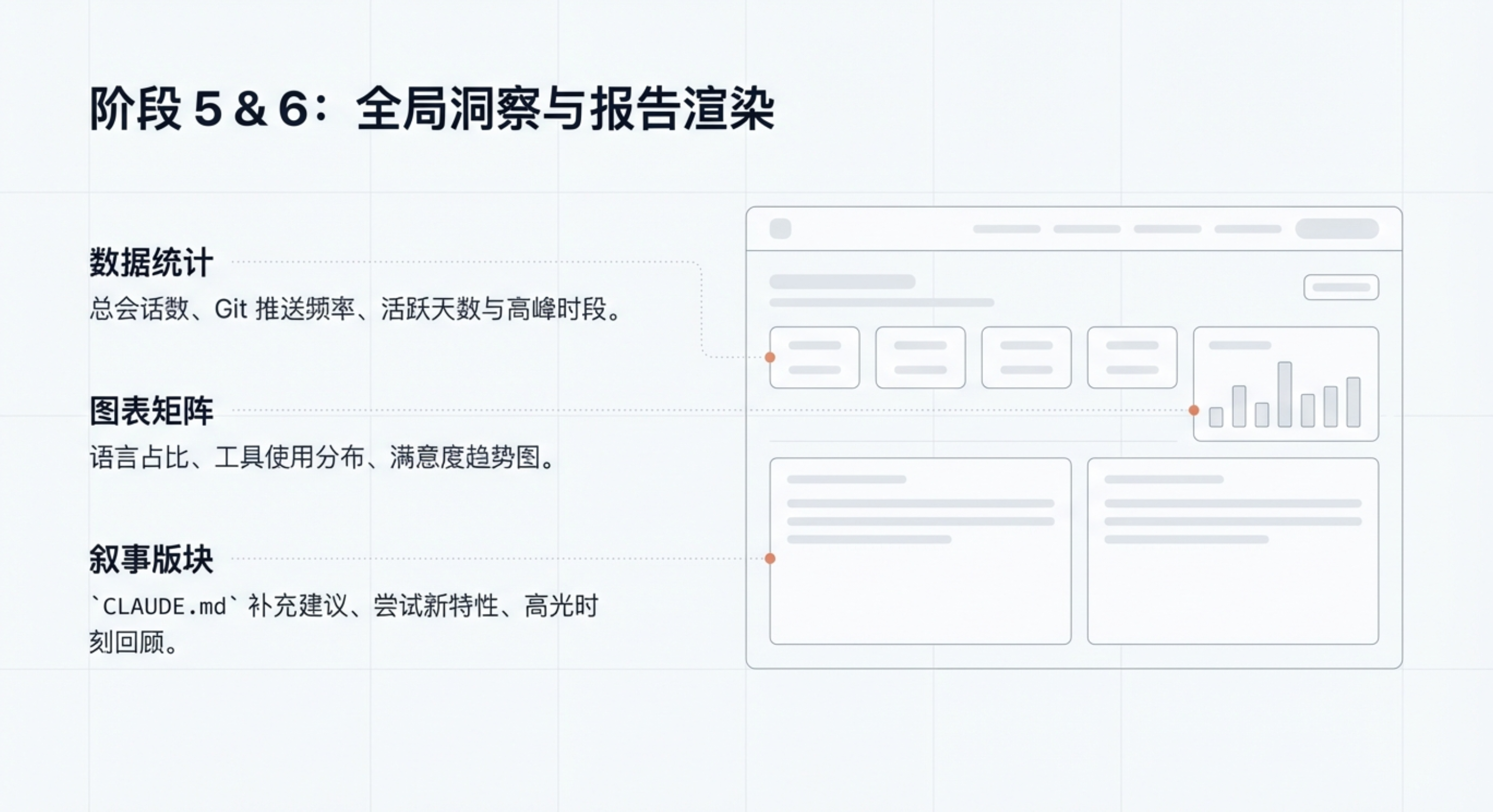 - 统计仪表盘:总会话数、活跃天数、代码行数变化、各工具使用频率、Git 提交统计。这是你行为的“硬数据”快照。