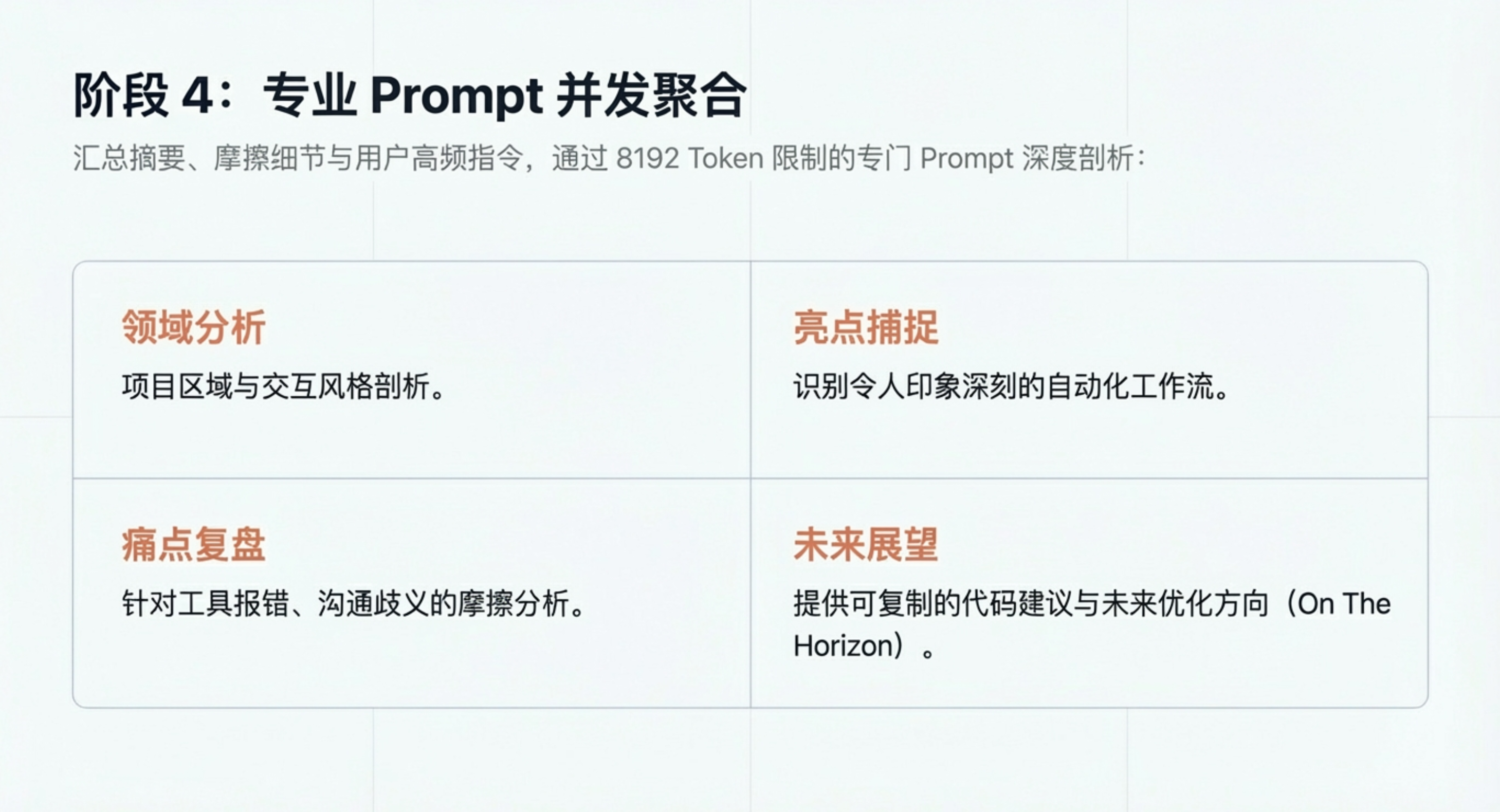 - 元数据提取:这一步量化你的行为。分析内容包括:Token 使用量、工具调用频率、编程语言分布、Git 提交活动,以及一个关键指标——用户中断率(你有多频繁地打断AI的工作)。
