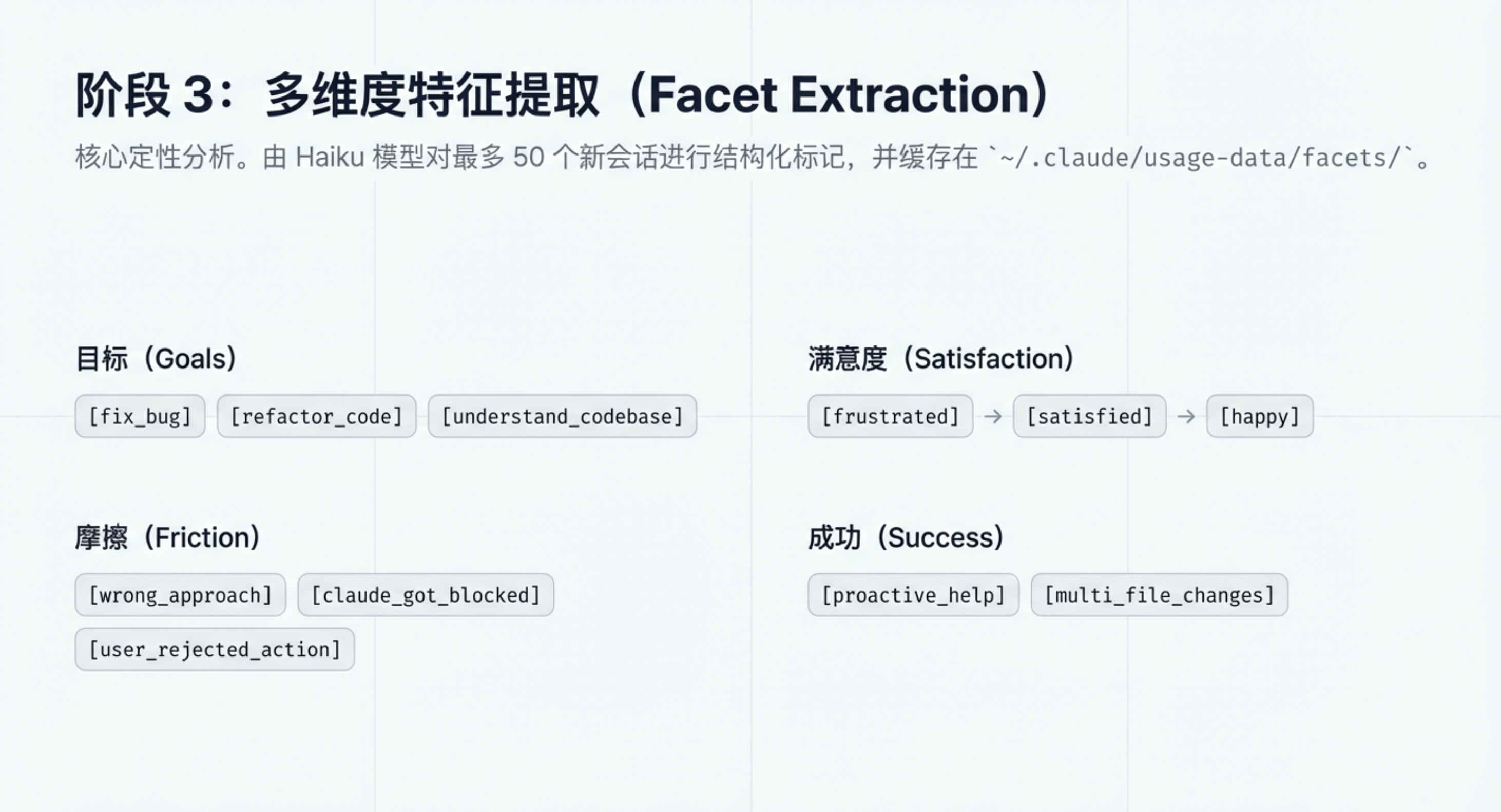 - LLM 深度分析:这是最巧妙的一步。系统使用 Claude 3 Haiku 模型对会话摘要进行定性评估,提取出所谓的 “面相”。这包括:你的满意度(从反馈中推断)、任务达成度,以及具体的摩擦类别(如代码错误、过度设计、理解偏差)。