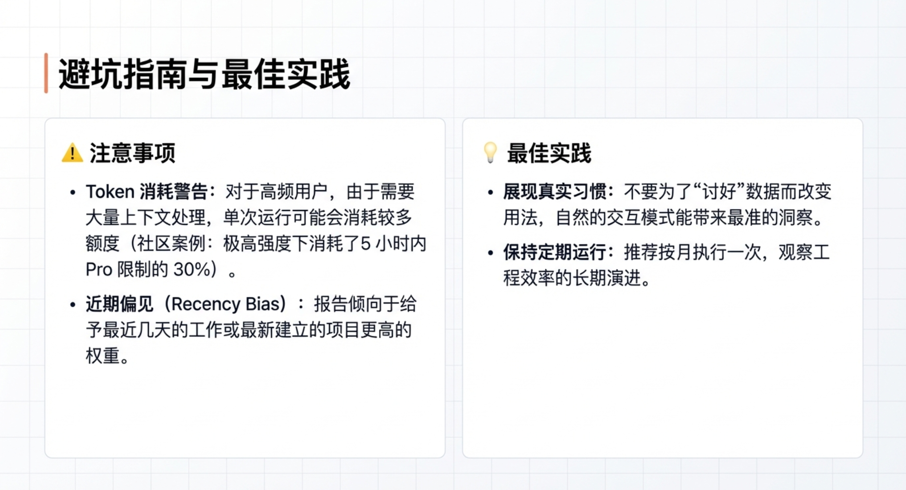 - 优化技巧:为了获得更准确的见解,建议定期运行该命令,并在日常会话中积极通过反馈(如说“谢谢”或“不对”)来帮助模型更准确地评估你的满意度。