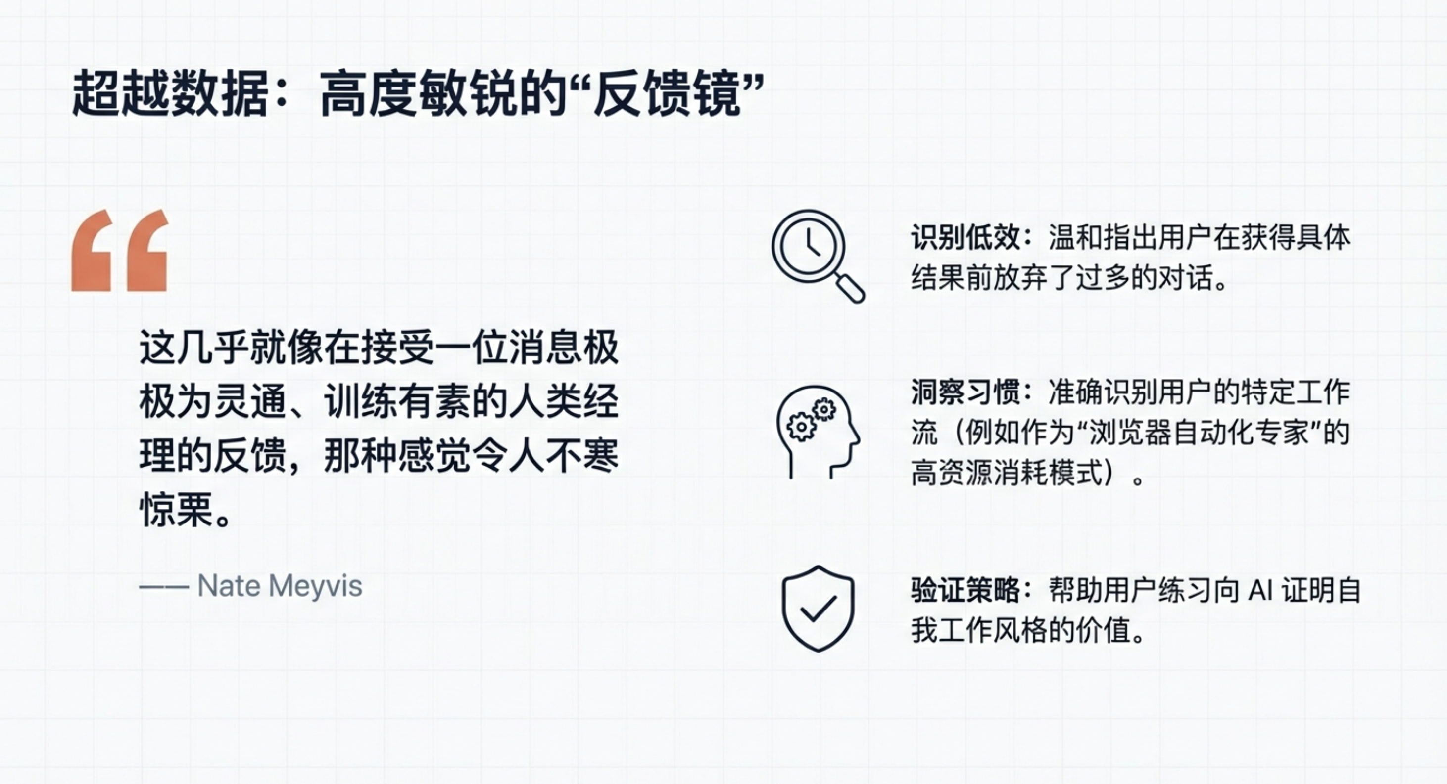 - 用户反馈:早期体验者形容,这份报告的感觉就像收到了“资深人类经理”的反馈——它能精准捕捉你的开发习惯,甚至能指出你自己都未曾察觉的模式。