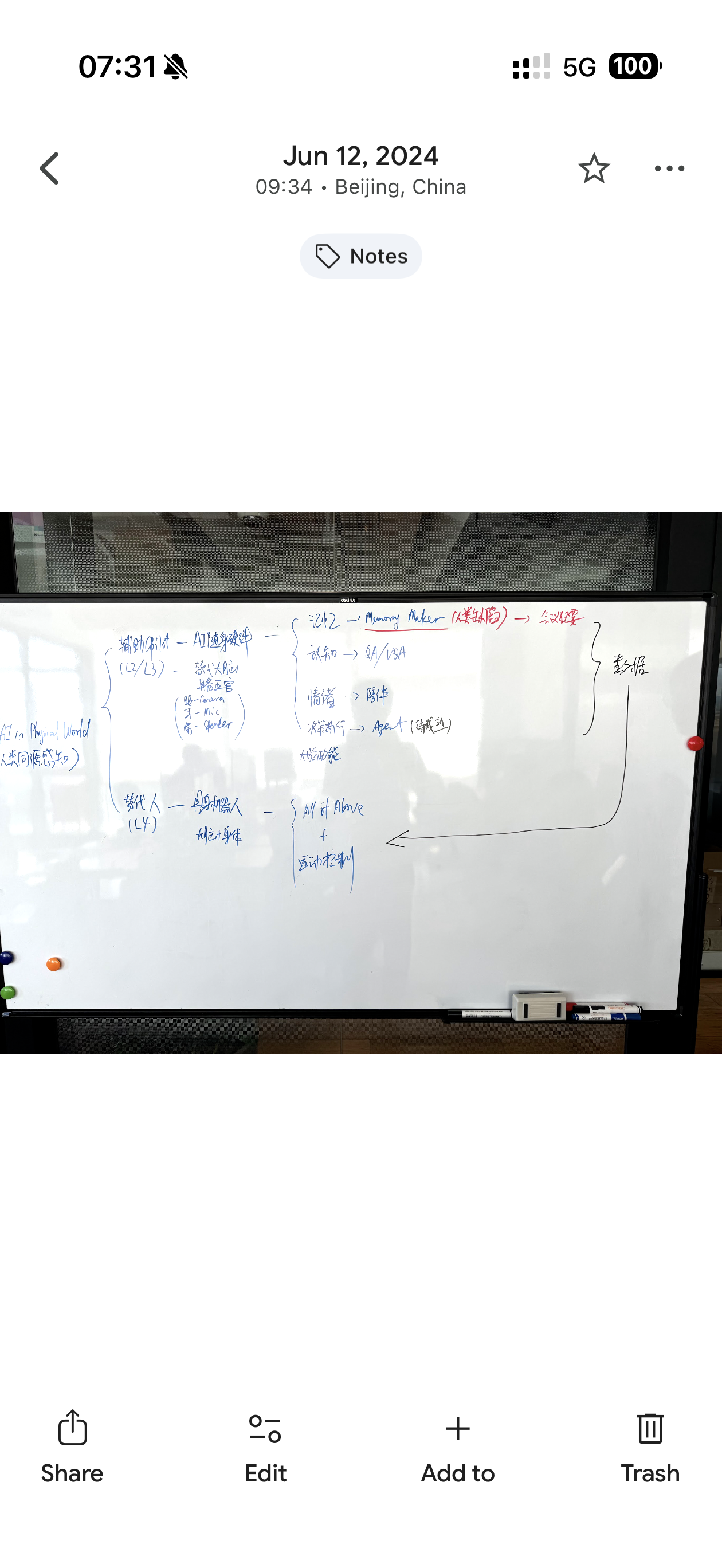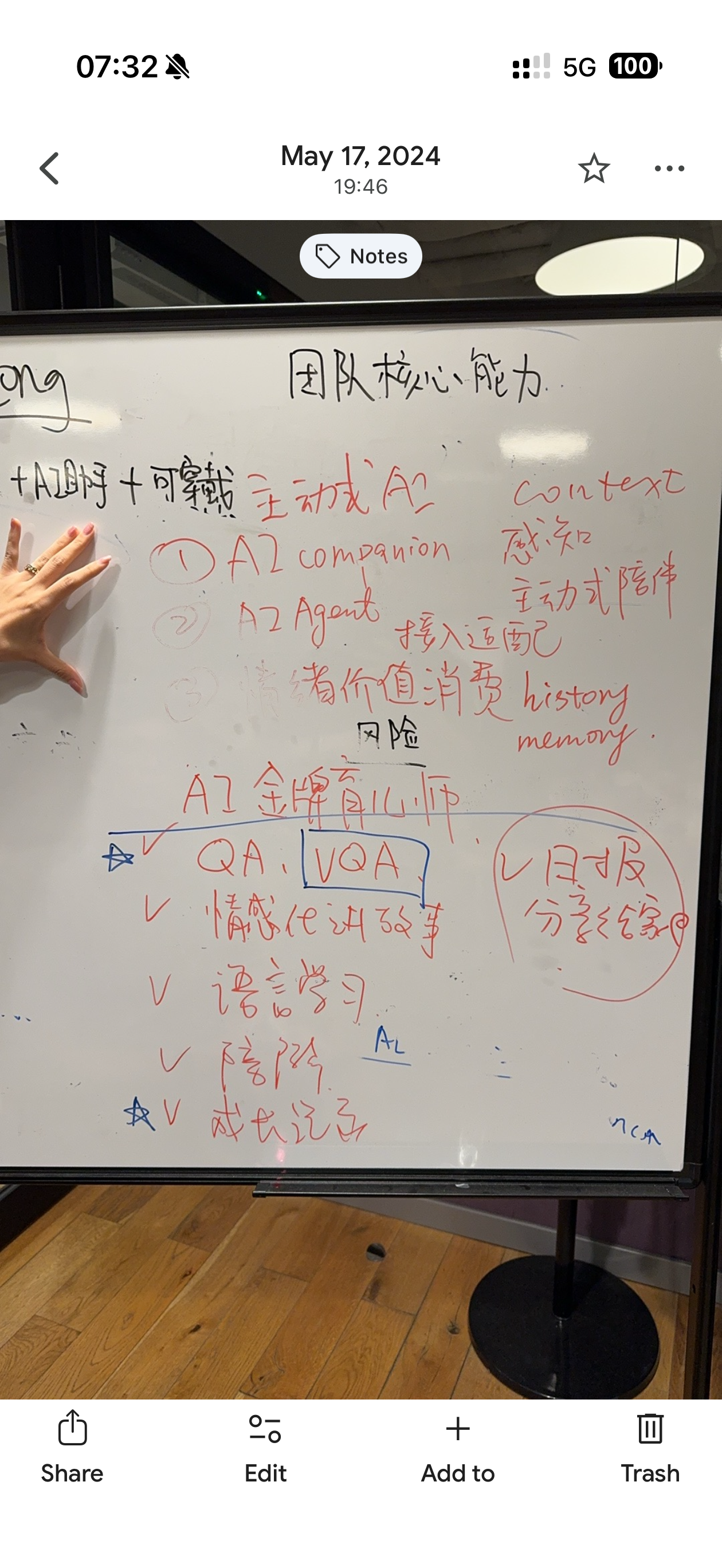 2024年5月和6月Looki内部会议的白板图,在近两年前,Looki在内部就确定了AI agent、AI companion等核心方向,真的很有前瞻性和技术视野!
