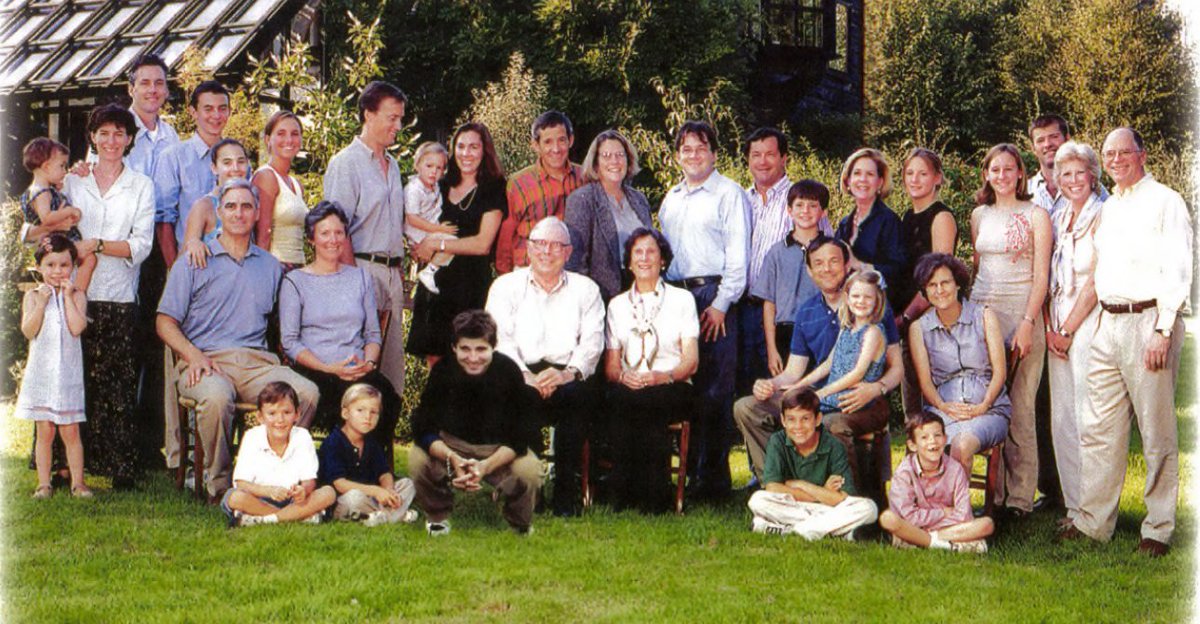 芒格全家福。芒格32岁走入第二段婚姻。他和妻子 Nancy 各自从第一段婚姻中带来2个孩子,然后又共同生了4个孩子。因此,芒格家族第二代就有8个孩子。