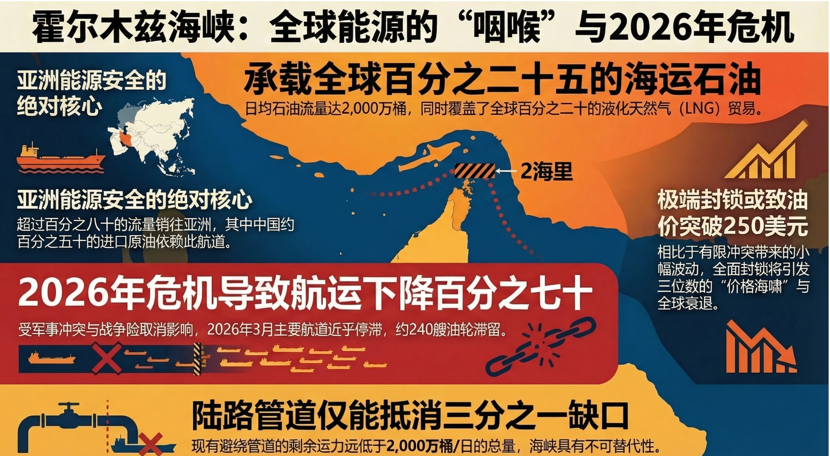本期节目聚焦2026年霍尔木兹海峡危机对全球经济的震荡。节目指出,该海峡不仅是全球能源转运的物理咽喉,更是亚洲经济的“呼吸器”。现代冲突已从传统的物理摧毁升级为赛博干扰与技术瘫痪,使得该区域极度易碎。由于陆路管道运力有限,海峡的封锁将直接导致全球战争风险溢价暴涨、保险停摆及通胀危机。此次危机正迫使亚洲大国加速能源结构转型,并寻求建立全新的、去中心化的地区安全框架,以应对现代“混合战争”带来的长期挑战。