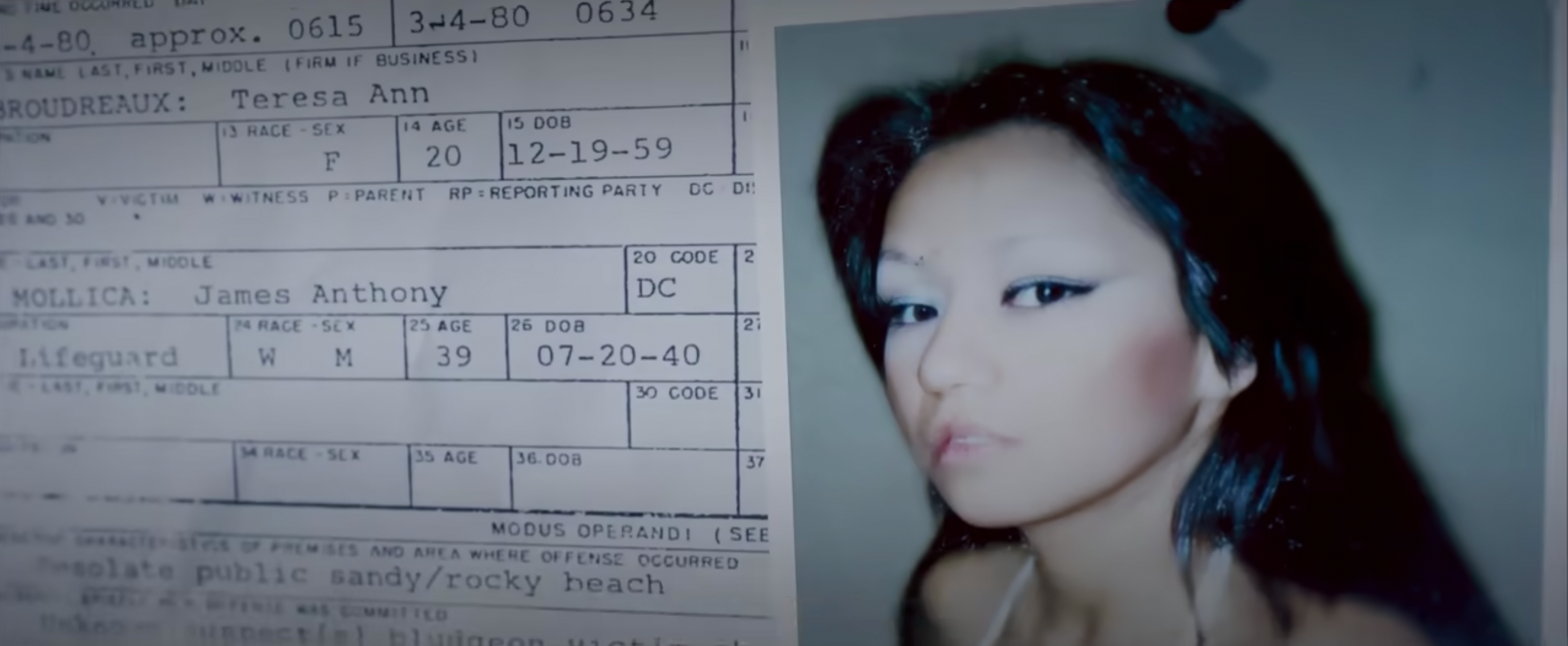 这位女性被摆成一个大字型,双腿朝着大海的方向,几乎全身赤裸,只穿了一双中筒袜,看样子有可能遭遇过性侵,她的头部被暴力击打,前额似乎有裂伤,满脸都是血,她的头发被血弄的黏黏糊糊的粘在一起,当时光线又暗,所以完全看不清她的五官。最先到达现场的David和搭档第一件事是确认受害者还有没有生命体征,他们发现受害者的身体还有温度,但是摸不到脉搏,应该是刚刚过世不久。她的腹部能看到有瘀伤还有不少擦伤,说明她在生前遭到暴力袭击。指甲里似乎有点东西,可能在遇到袭击的时候她曾经反抗过。而受害者的身份当场就被确认了,最先拨打911的热心人在附近先发现了受害者的包,里面有她的ID。