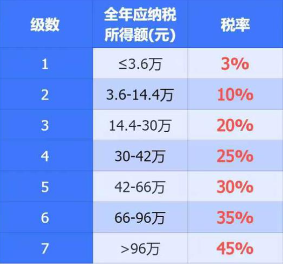 - 对照表格:不超过3.6万(3%)、3.6万-14.4万(10%)……最高45%