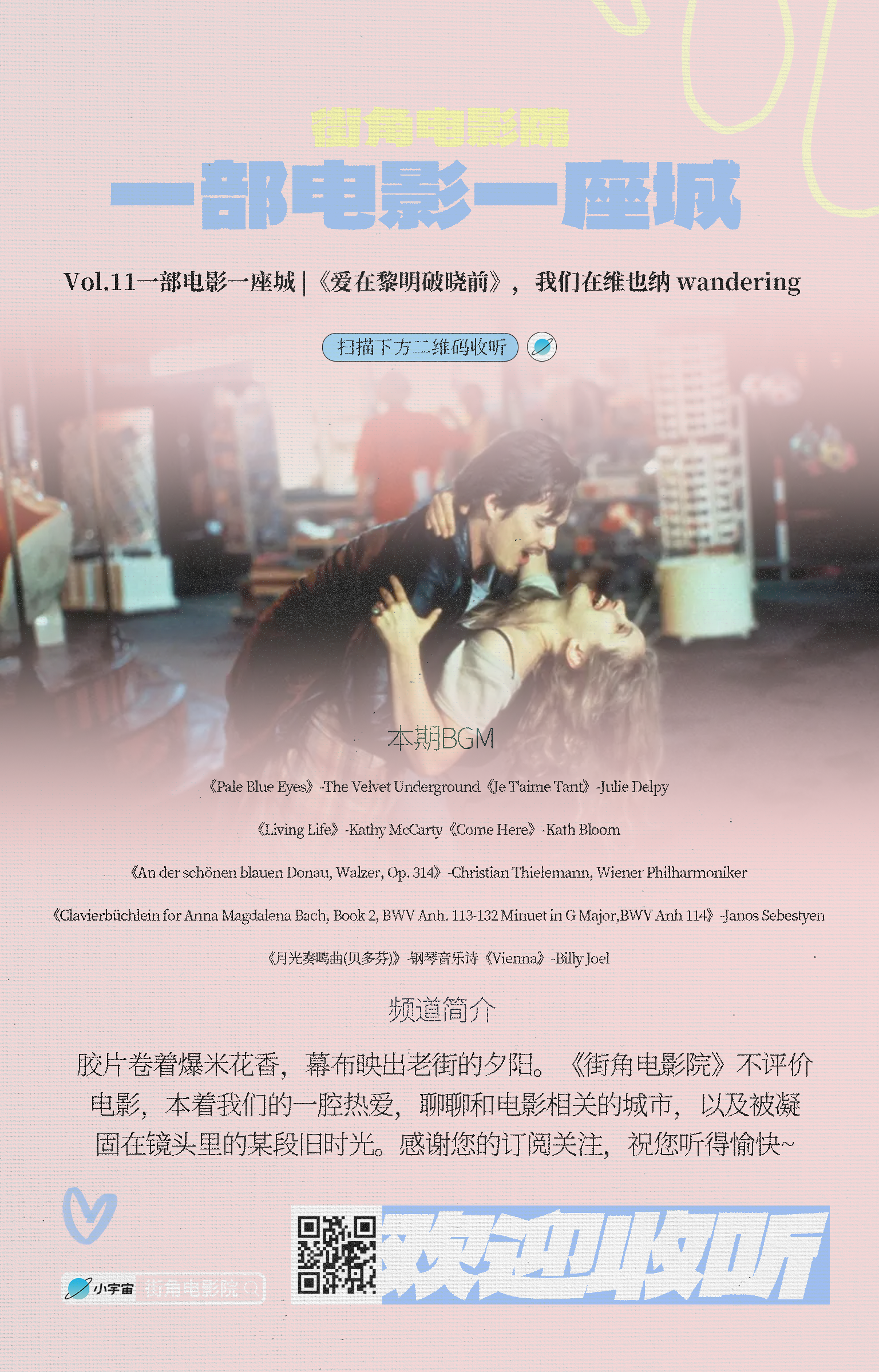 本期节目以电影《爱在黎明破晓前》为入口,跟着杰西和赛琳一同游玩维也纳。从火车上的偶遇,到海关桥上的心动,再到唱片行试听室里那首《Come Here》......我们还会聊聊维也纳作为“花园城市”与“音乐之都”的双重魅力,以及这座城市缓慢、沉思、开放的独特气质如何与电影形成完美互文。