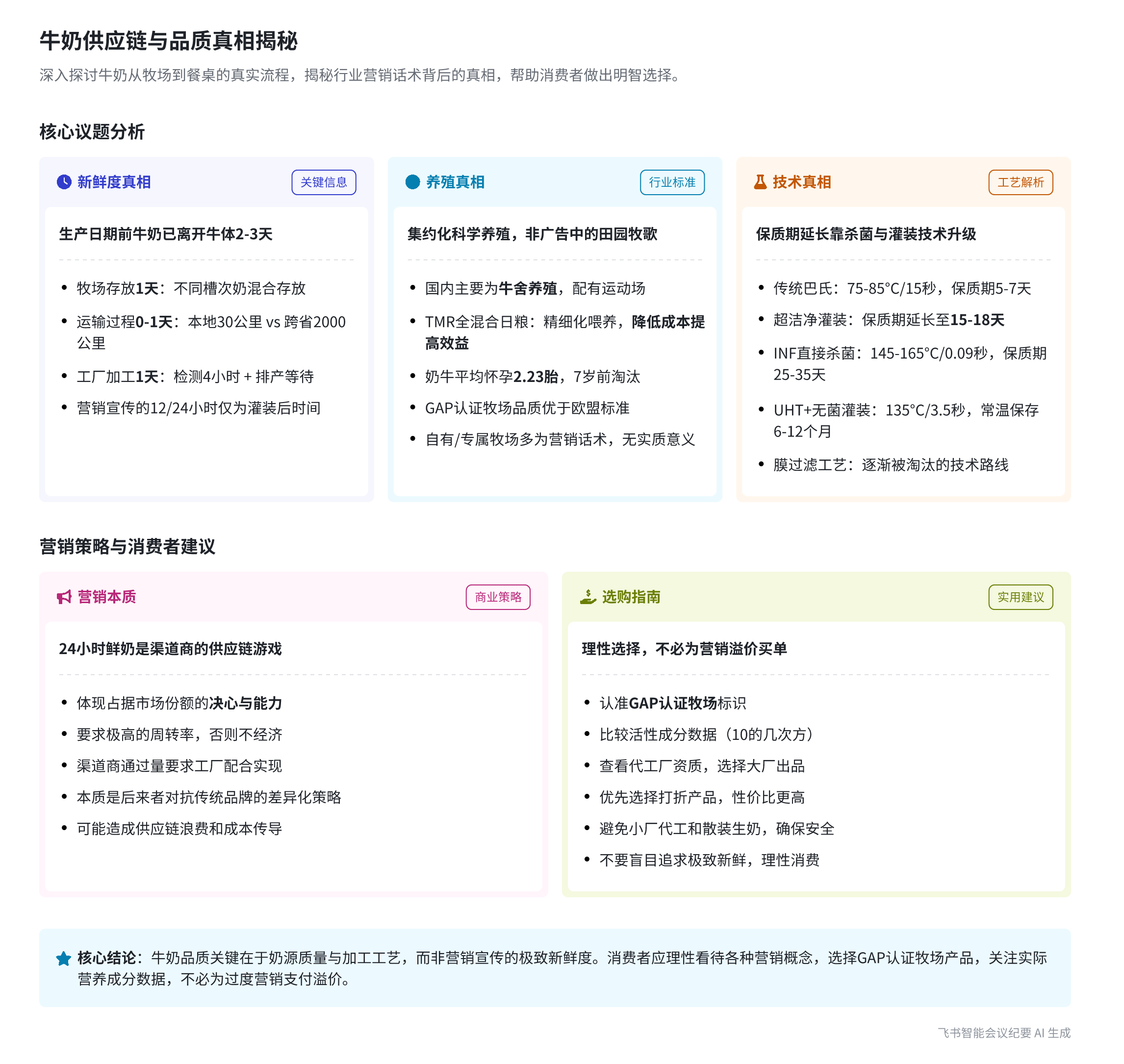 节目不仅会聊到“24 小时鲜”背后的商业逻辑,也会拆解乳品行业这些年不断强调的“锁鲜技术”:从原奶洁净度提升,到巴氏杀菌和瞬时高温杀菌,再到超洁净灌装和冷链体系升级。同时,我们也聊到奶牛养殖方式、牧场认证、TMR 饲喂以及牛奶品质标准等行业细节。当我们把这些信息拼在一起,就会发现:今天牛奶越来越“新鲜”,既有真实的技术进步,也有市场竞争中的营销叙事。理解一杯牛奶的真实时间线,或许比单纯追求“更快更新鲜”更重要。