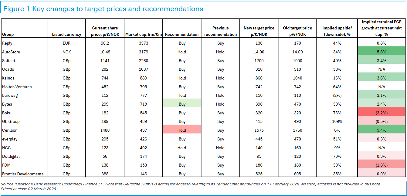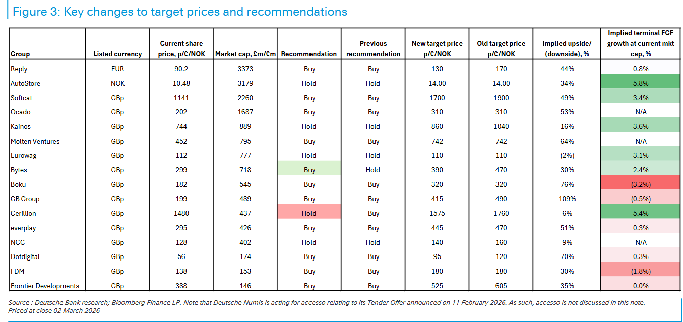 图1(研报第2页)的评级调整更具参考性:Bytes因估值深度回调获上调至“买入”,Cerillion则因相对估值偏高降至“持有”,而Softcat、GB Group、Boku、everplay四大核心标的维持“买入”评级,成为波动中的确定性选择。