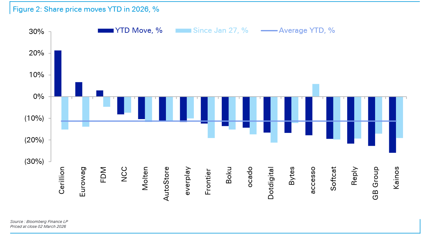 图2(研报第4页)清晰呈现板块分化:Cerillion因大额合同中标股价逆势走强,Eurowag、AutoStore等依赖物理自动化的企业受冲击较小;而Kainos、Reply等IT服务公司及Softcat、Bytes等经销商跌幅居前,GB Group这类处于转型期的企业也未能幸免。这种分化本质是AI冲击的差异化映射——业务越贴近纯软件服务,短期压力越明显。