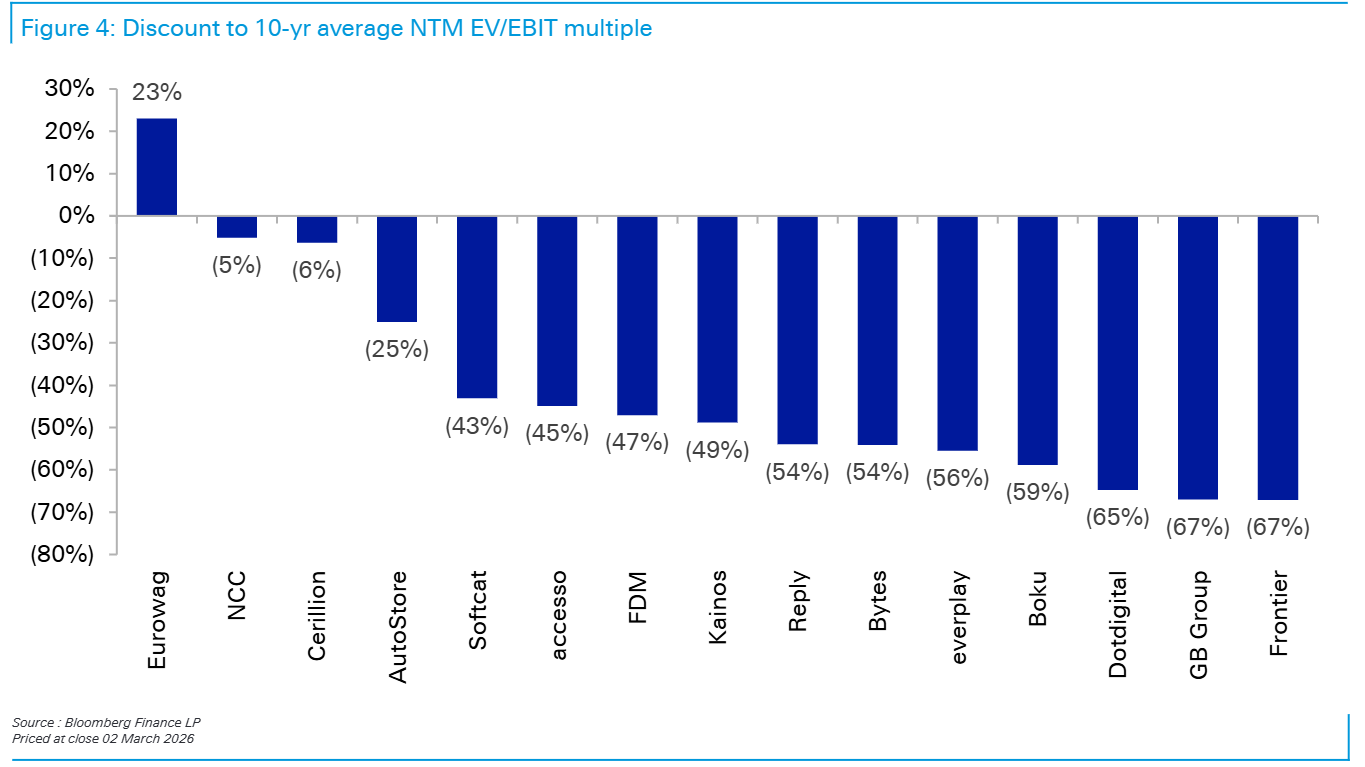 图4(研报第8页)揭示估值洼地:板块内多数公司EV/EBIT较十年均值大幅折价,GB Group、Dotdigital等折价幅度超60%,部分企业甚至处于历史最低估值区间。这意味着市场对AI的负面预期已过度定价,忽略了企业的自适应能力。