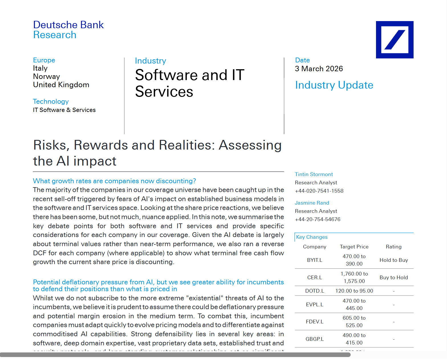 德国德意志银行(Deutsche Bank)3月3日发布《Risks, Rewards and Realities: Assessing the AI impact》行业更新报告,直指软件与IT服务行业正经历AI引发的估值重构,看似恐慌性抛售下,部分企业已显现配置价值。