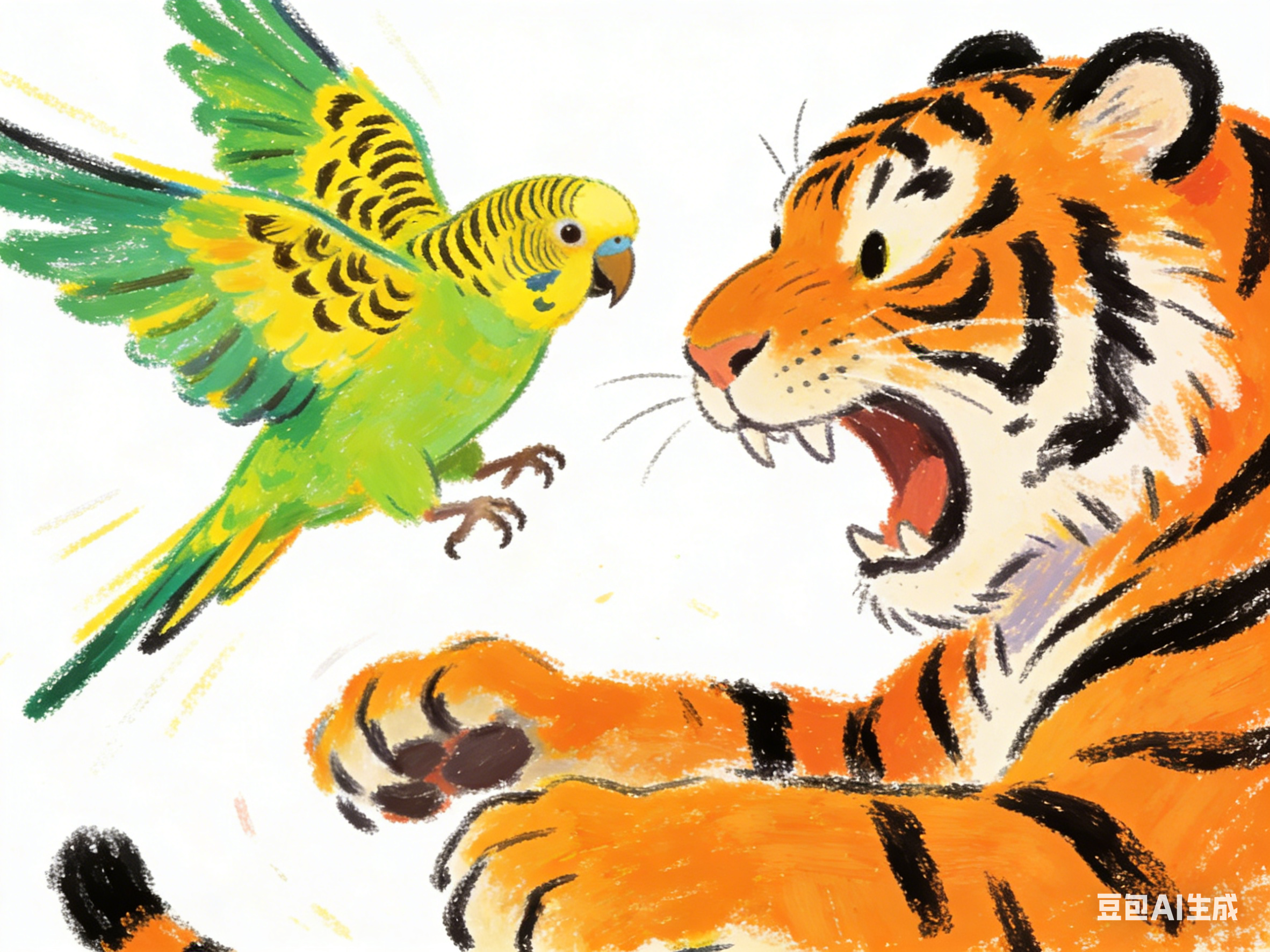 鸟爸爸落在它面前,羽毛都炸开了,小小的身体却挡在树洞口。它知道自己太小了,小到老虎一口就能吞掉。可它不能退,身后是它的妻子,是它还没出生的孩子们。