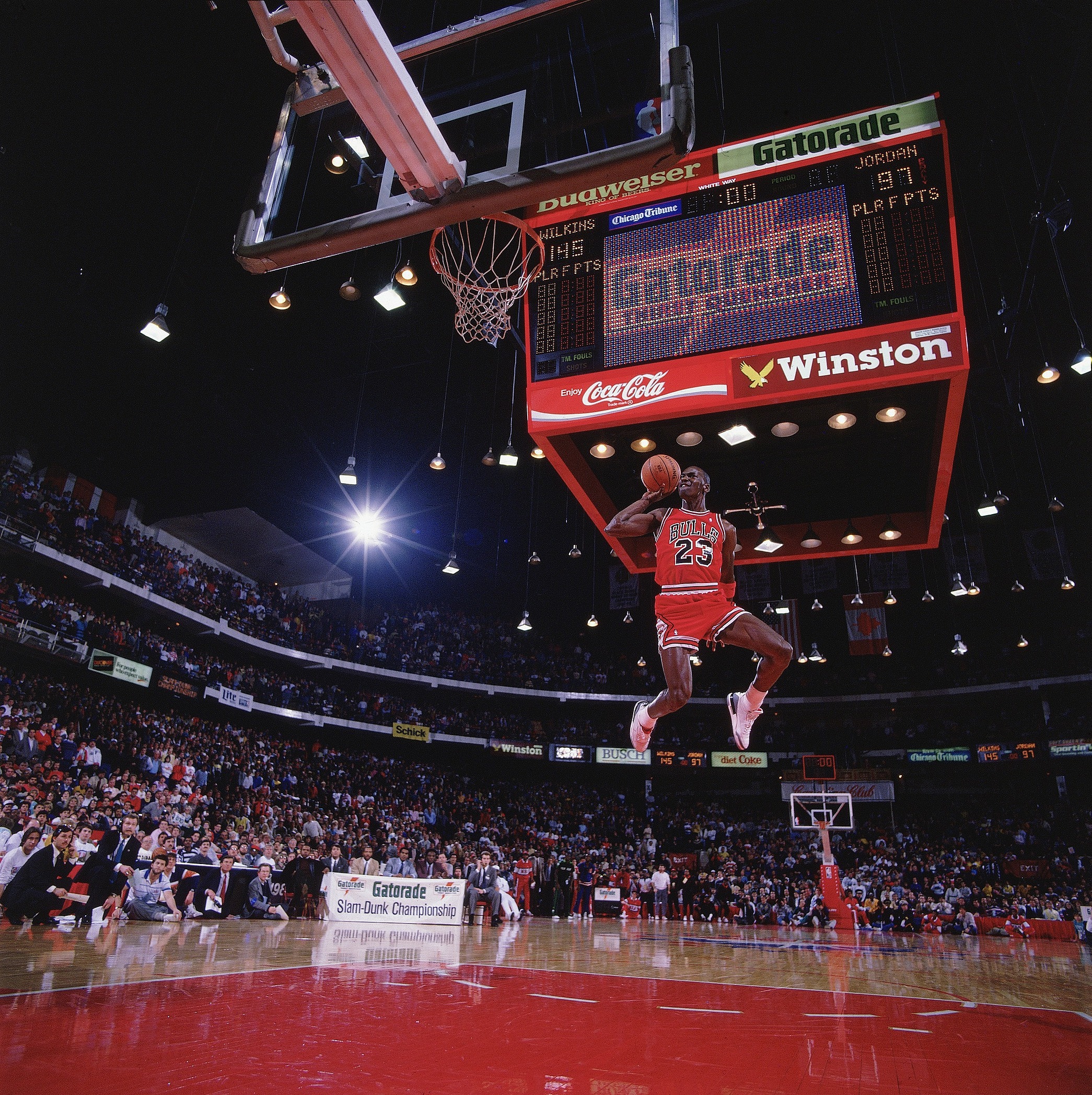 👇🏼 1988年NBA全明星扣篮大赛,乔丹罚球线起跳扣篮。摄影:沃尔特·伊欧斯(Walter Iooss)