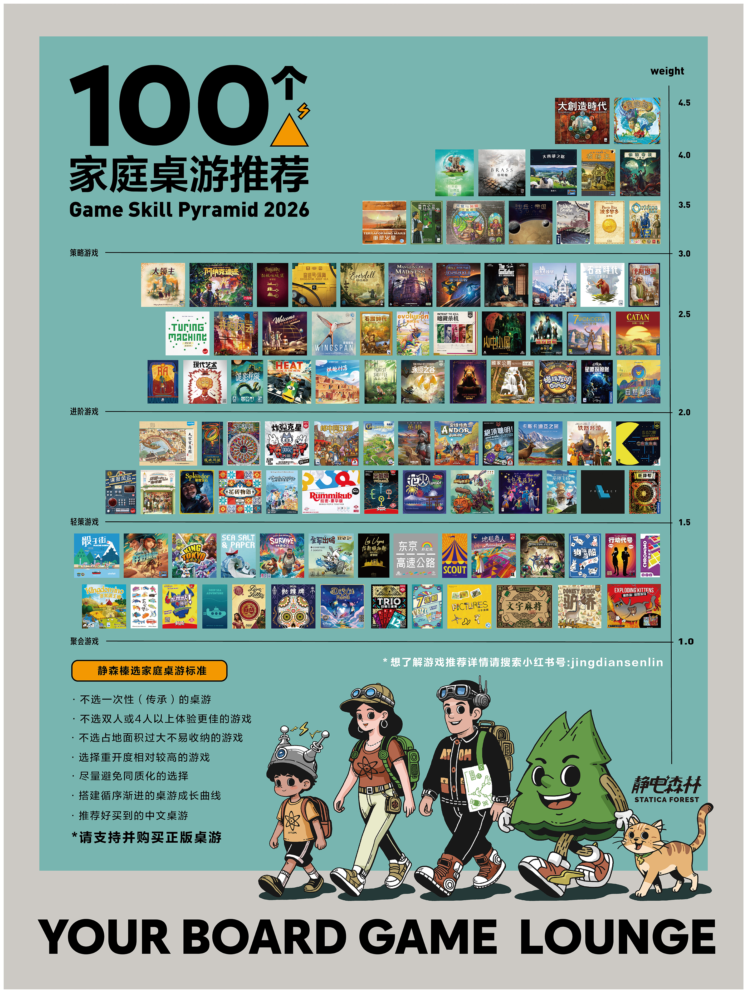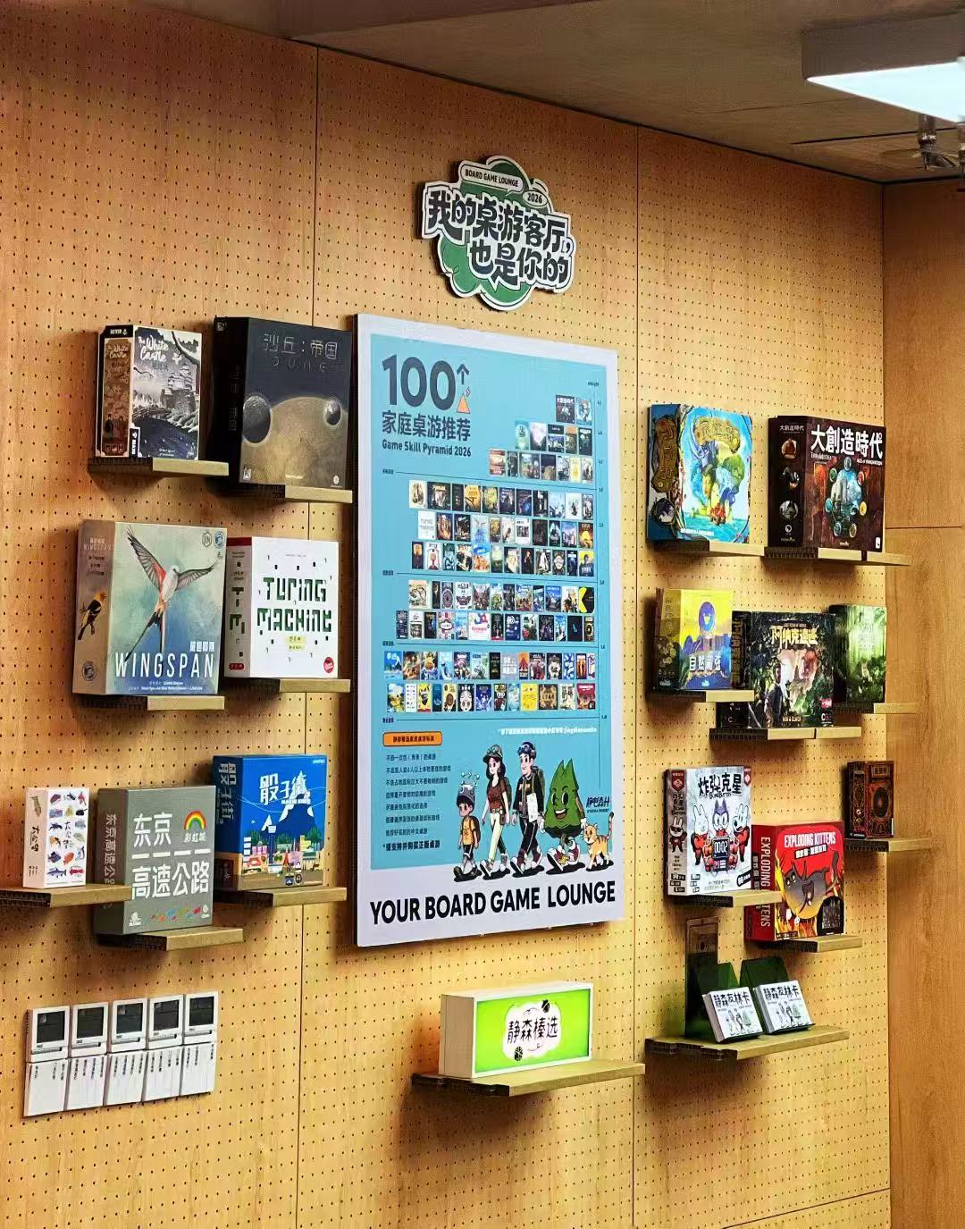 于是借着静电森林小站店开业,我们做了一个企划:列出一些选择“家庭游戏”的标准,搭建了一个“家庭游戏金字塔”。从简单到难,列出了100个在过去几年游戏推广的过程中,适合家庭选购的。如果你之前没有玩过游戏,第一次来到小站的静森,从最简单的开始玩,一步步打卡,最终攀登上金字塔的顶端,一定能感受到桌游深厚且多元的魅力。