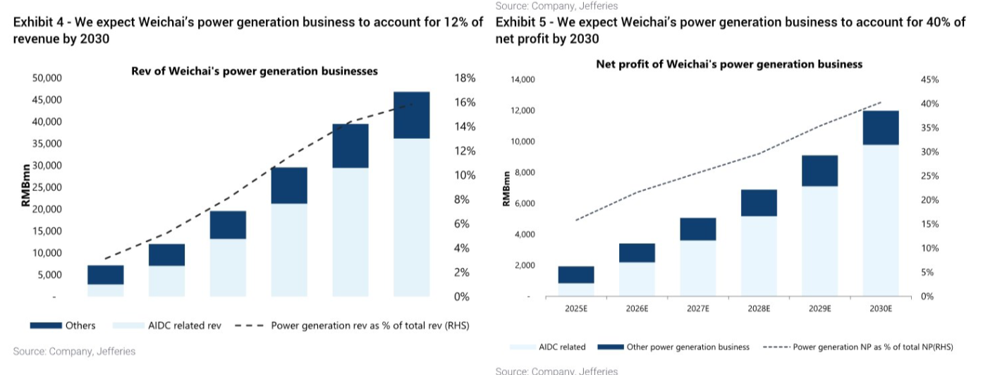 潍柴动力的发电业务更是未来核心增长极,Exhibit 4(We expect Weichai's power generation business to account for 12% of revenue by 2030) 与Exhibit 5(We expect Weichai's power generation business to account for 40% of net profit by 2030) 两组图表形成鲜明的价值印证:2030年潍柴发电业务营收占比将达12%,而净利润占比却能突破40%,足见该业务的高盈利性。研报预计,2026-2027年公司净利润将达157.76亿元、197.52亿元,其中AIDC业务占比14%、18%,而发电业务凭借全品类组合、北美成熟渠道及认证能力的核心壁垒,成为业绩增长的核心推手。