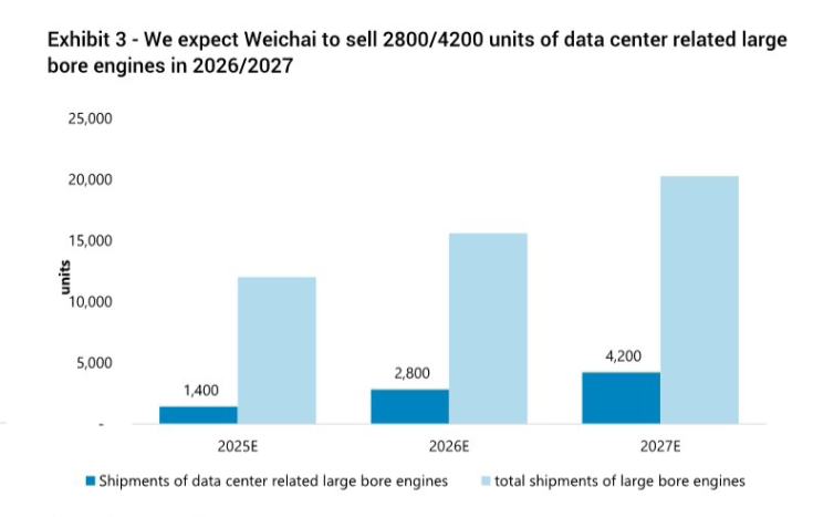 在此背景下,潍柴的大缸径柴油发动机成为核心受益品类,Exhibit 3(We expect Weichai to sell 2800/4200 units of data center related large bore engines in2026/2027) 显示,潍柴2025年数据中心相关大缸径发动机出货仅1400台,2026年将跃升至2800台、2027年进一步至4200台,增长趋势显著,2026-2027年该业务将为公司贡献16%、20%的净利润。