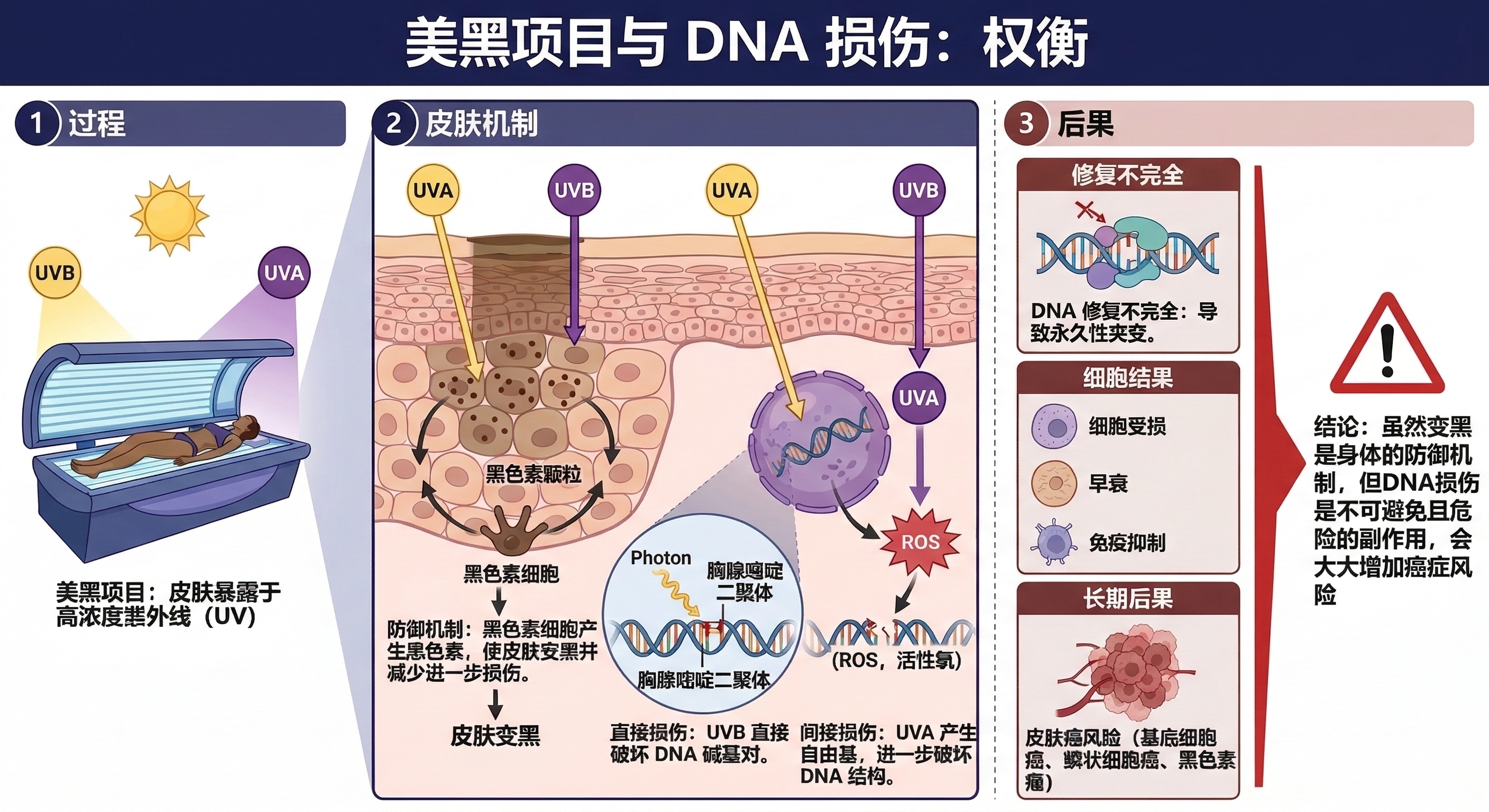 图片揭示了播客中讨论的美黑代价:即便使用经过调优的美黑床,其高浓度紫外线依然会造成 DNA 直接损伤及自由基间接伤害 。虽然变黑是皮肤的防御机制,但不可避免地会导致细胞早衰并大幅增加皮肤癌风险,这正是医生不建议长期美黑的核心原因 。