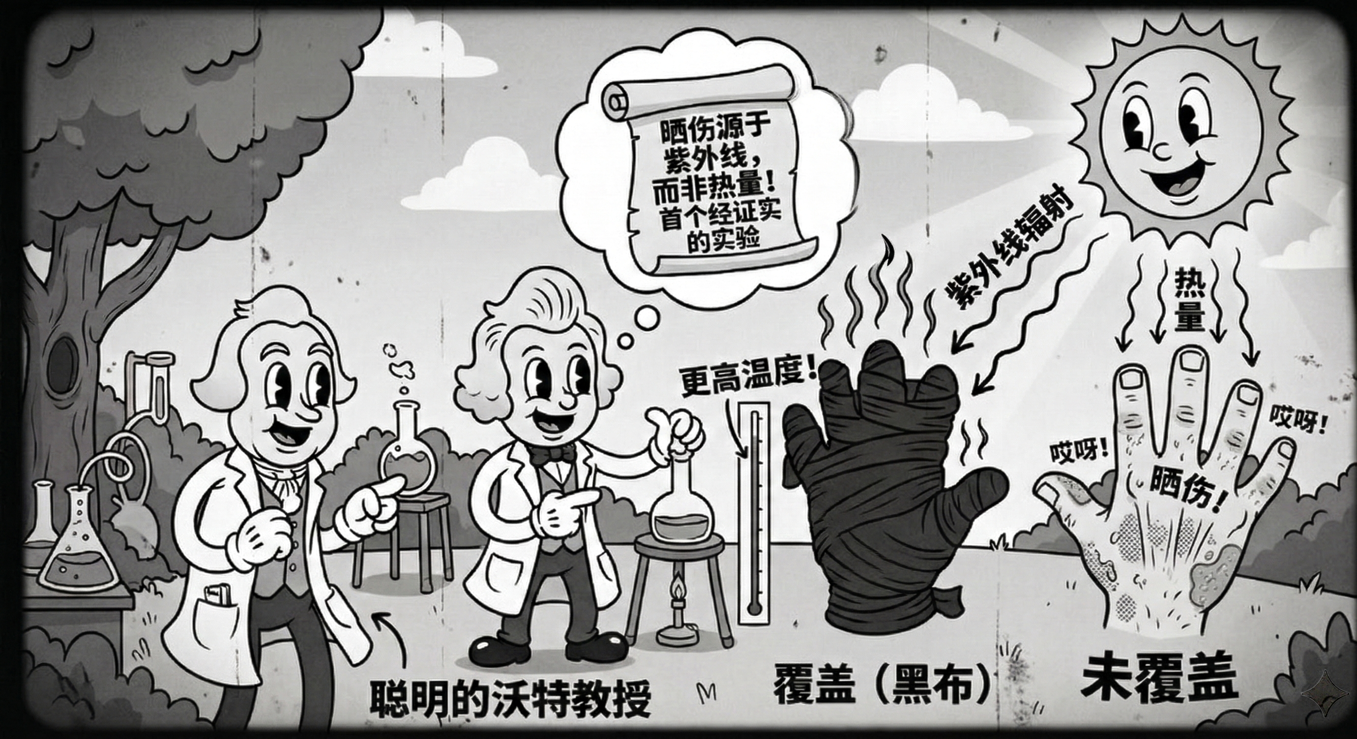 图片还原了播客中提到的经典科学实验:沃特教授证实晒伤源于紫外线而非热量 。实验中,覆盖黑布的手虽然温度更高,但并未受损;而直接暴露在阳光下的手却出现了明显的晒伤 。这有力地证明了隐形的紫外线辐射才是造成皮肤损伤的元凶 。