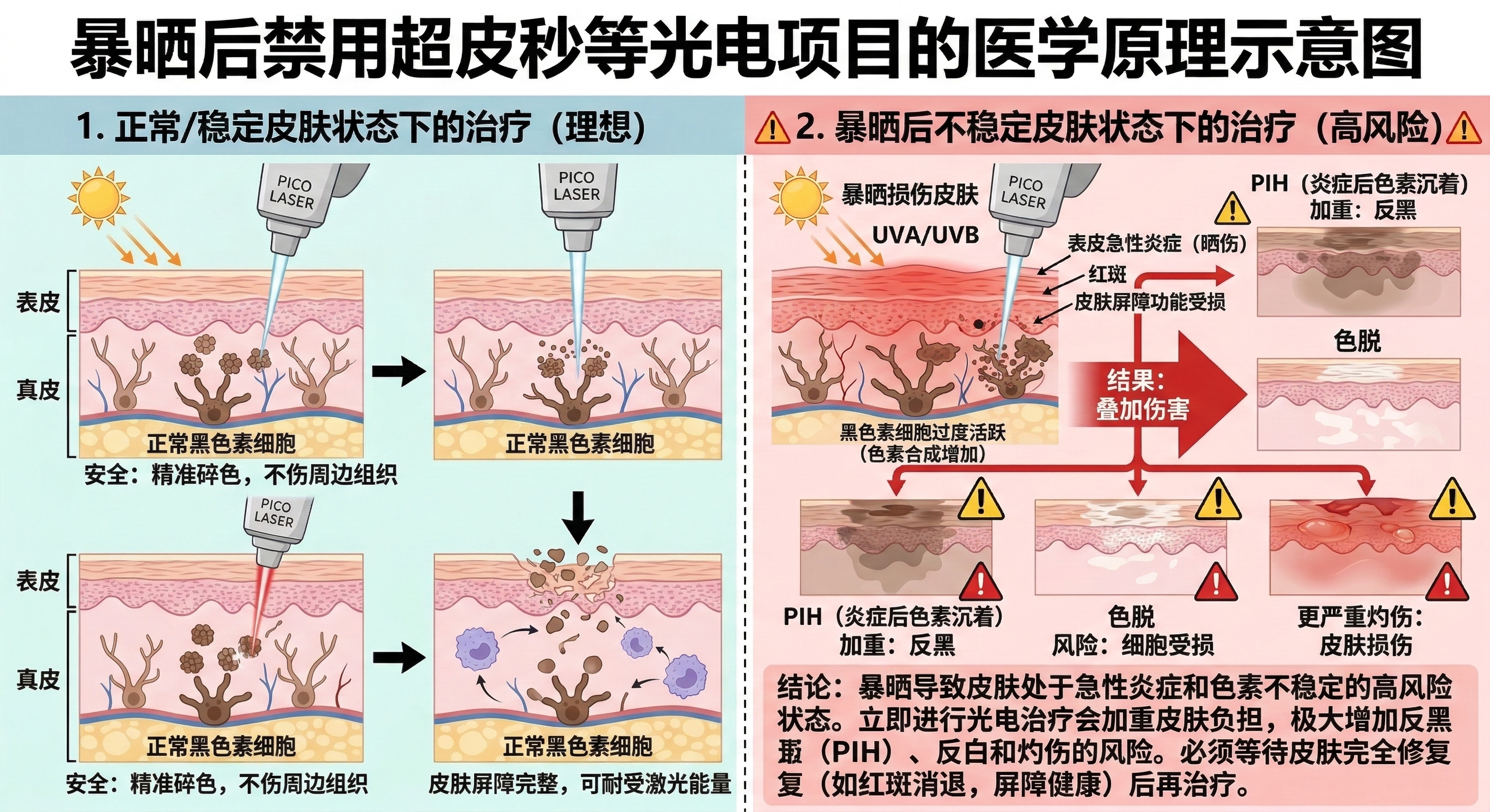 图片展示了暴晒后禁用超皮秒等光电治疗的医学原理。晒后皮肤处于急性炎症期,黑素细胞异常活跃,此时强行治疗无异于“火上浇油” 。这会导致反黑(PIH)、色脱或灼伤等高风险 。专家建议至少等待 2 到 4 周,待皮肤屏障完全修复后再考虑光电项目 。