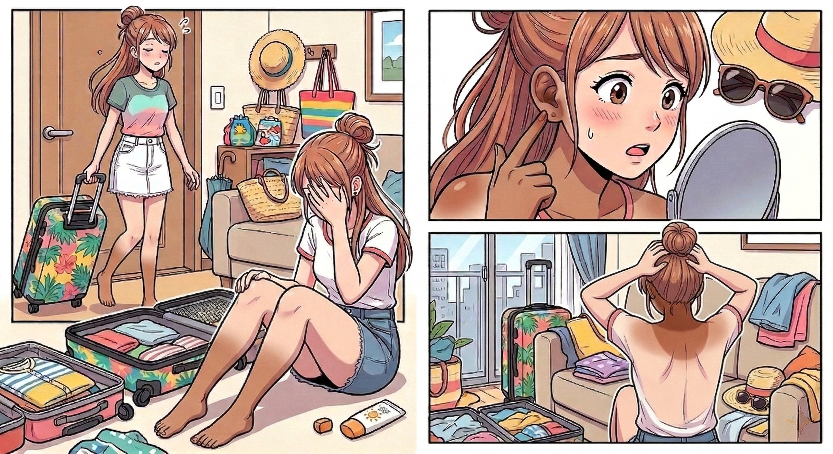 插画还原了播客中提到的度假后“奥利奥”肤色不均现象 。画面展示了背部和腿部明显的晒痕分界线 ,并特别强调了医生的“终极测试指标”——耳垂 。正如节目所述,耳垂是防晒最易被忽视的死角,其肤色能直接反映真实的紫外线暴露强度 。