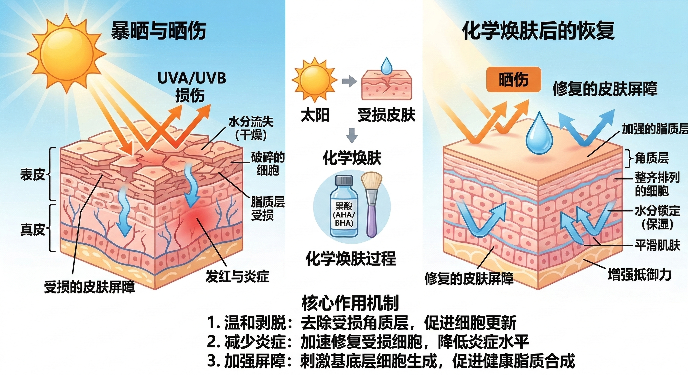 图片展示了播客提倡的化学焕肤(如 12% 乳酸)修复逻辑 。通过温和剥脱受损角质并转化为天然保湿因子,它能有效促进细胞更新、锁水并强化屏障 。这是专家在晒后稳定期用于同步改善炎症、干燥及色沉的皮肤重建方案 。