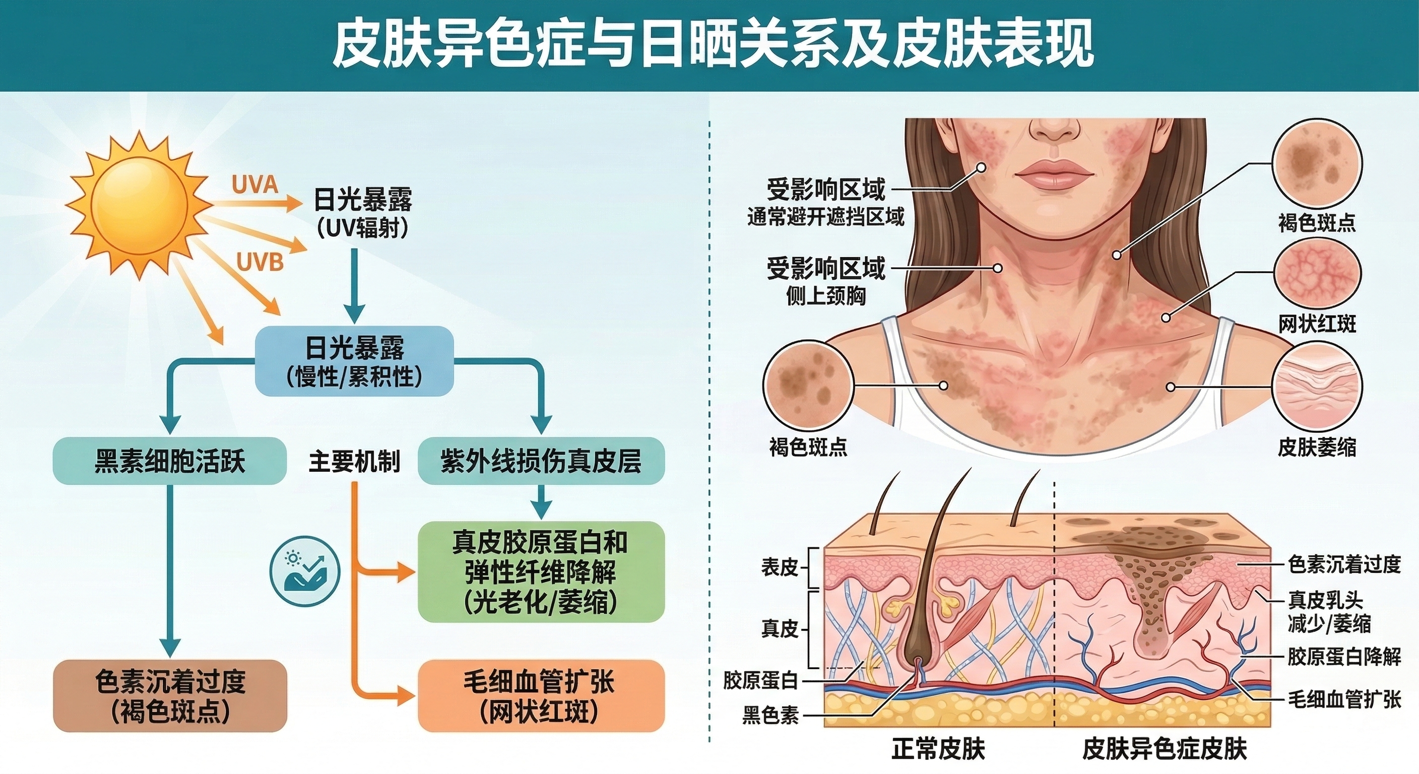 图片详述了长期紫外线曝光诱发的“皮肤异色症”机制 。紫外线辐射不仅会激活黑素细胞导致色素沉着(褐色斑点),更会损伤真皮层,导致胶原蛋白降解(光老化)并诱发毛细血管扩张(网状红斑) 。正如播客所述,这种典型的慢性光老化常伴随皮肤萎缩与质地改变 。