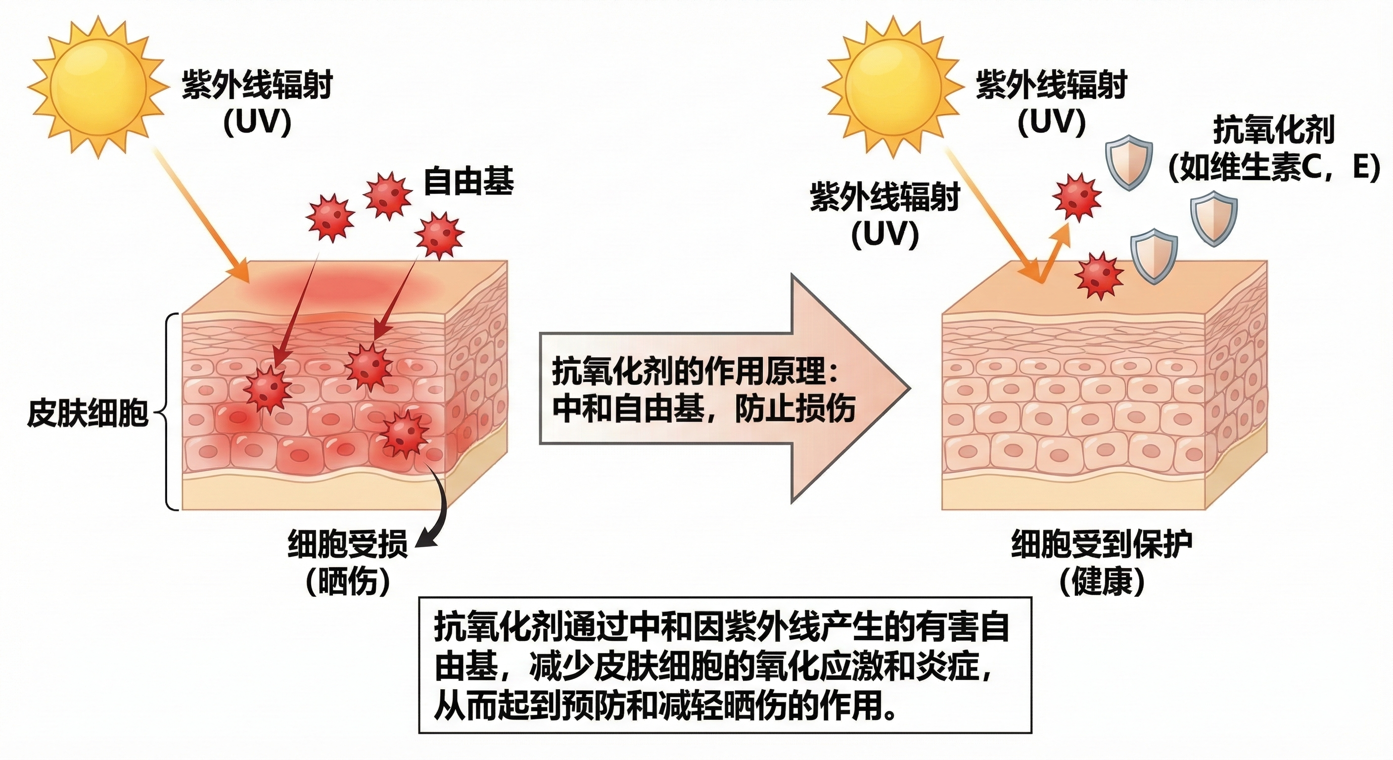 图片展示了播客中提到的“还债”逻辑 。紫外线辐射会诱导皮肤产生大量氧自由基,导致细胞受损和炎症 。抗氧化剂(如维C、维E)通过及时中和这些自由基,起到“护盾”作用,从而预防和减轻晒伤 。正如医生所说,这就像是在皮肤的“ATM机”里提前存钱,以抵消白天的日晒透支 。