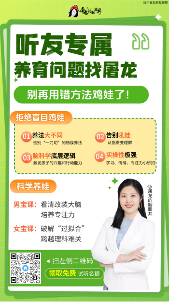内容由「屠龙的胭脂井」特别呈现,屠龙老师是清华脑科学博士、美国卡内基・梅隆大学博后,深耕脑科学领域多年,基于近十年脑科学最新研究成果,打造专属男宝、女宝的科学养育课程。无鸡汤全干货,手把手教你读懂孩子大脑,搭配中医穴位按摩、饮食调理、作息指导等落地方法,让养娃更科学、更省心。