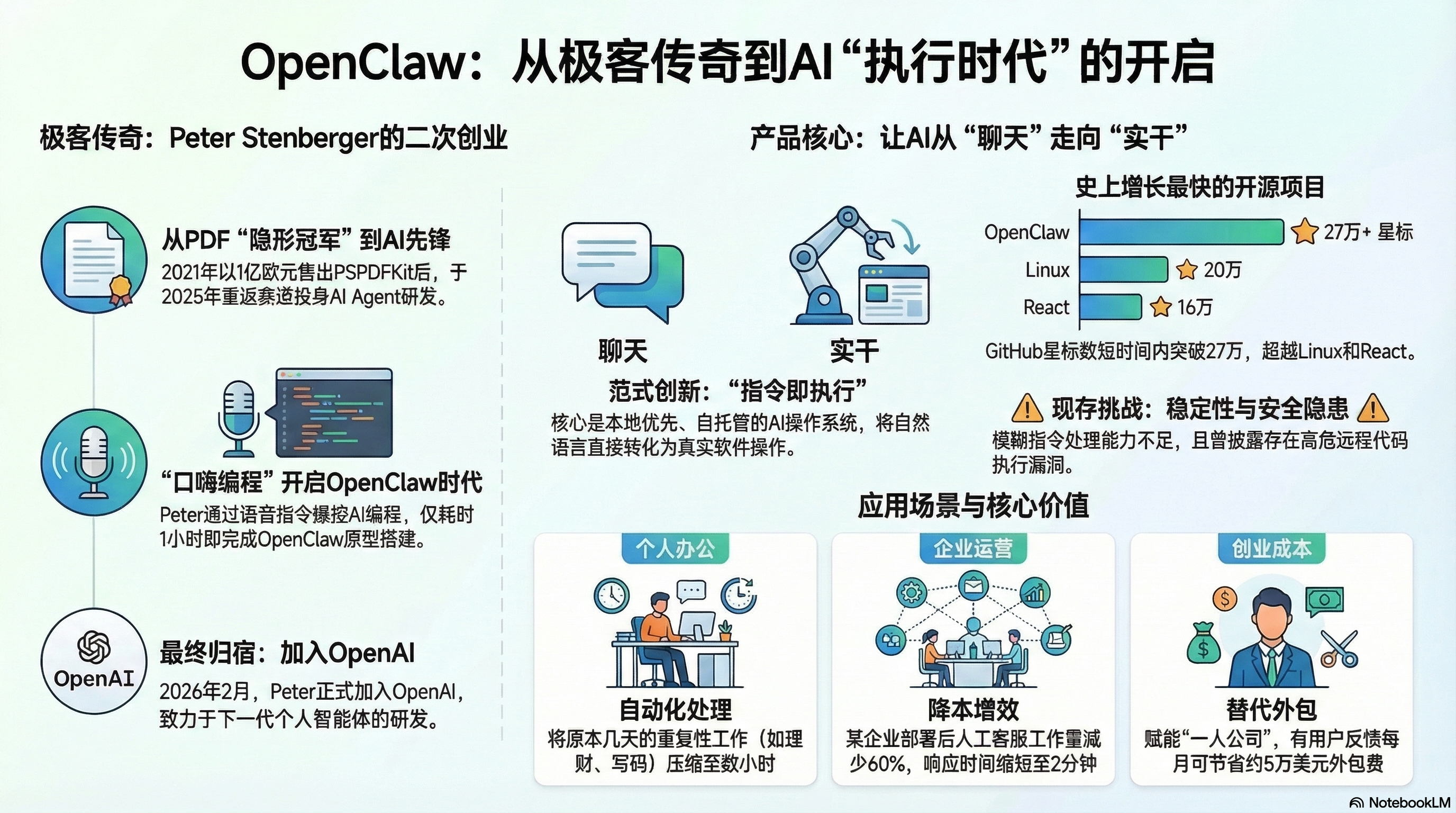2026年初,OpenClaw以席卷之势引爆全球科技圈,GitHub星标数短期内突破27万,超越Linux、React成为史上增长最快的开源项目,被国内开发者亲切称为“大龙虾”AI助理。这款开源AI智能体的爆火,让其开发者——奥地利软件工程师Peter Stenberger(彼得·斯坦伯格)再次走进公众视野。从PDF SDK领域的“隐形冠军”到AI智能体赛道的现象级创造者,Peter的极客人生充满传奇色彩。本文将基于公开事实,全面复盘Peter的成长经历,解析OpenClaw爆火的核心逻辑、创新价值、现存不足,以及其对全球AI产业的深远影响。