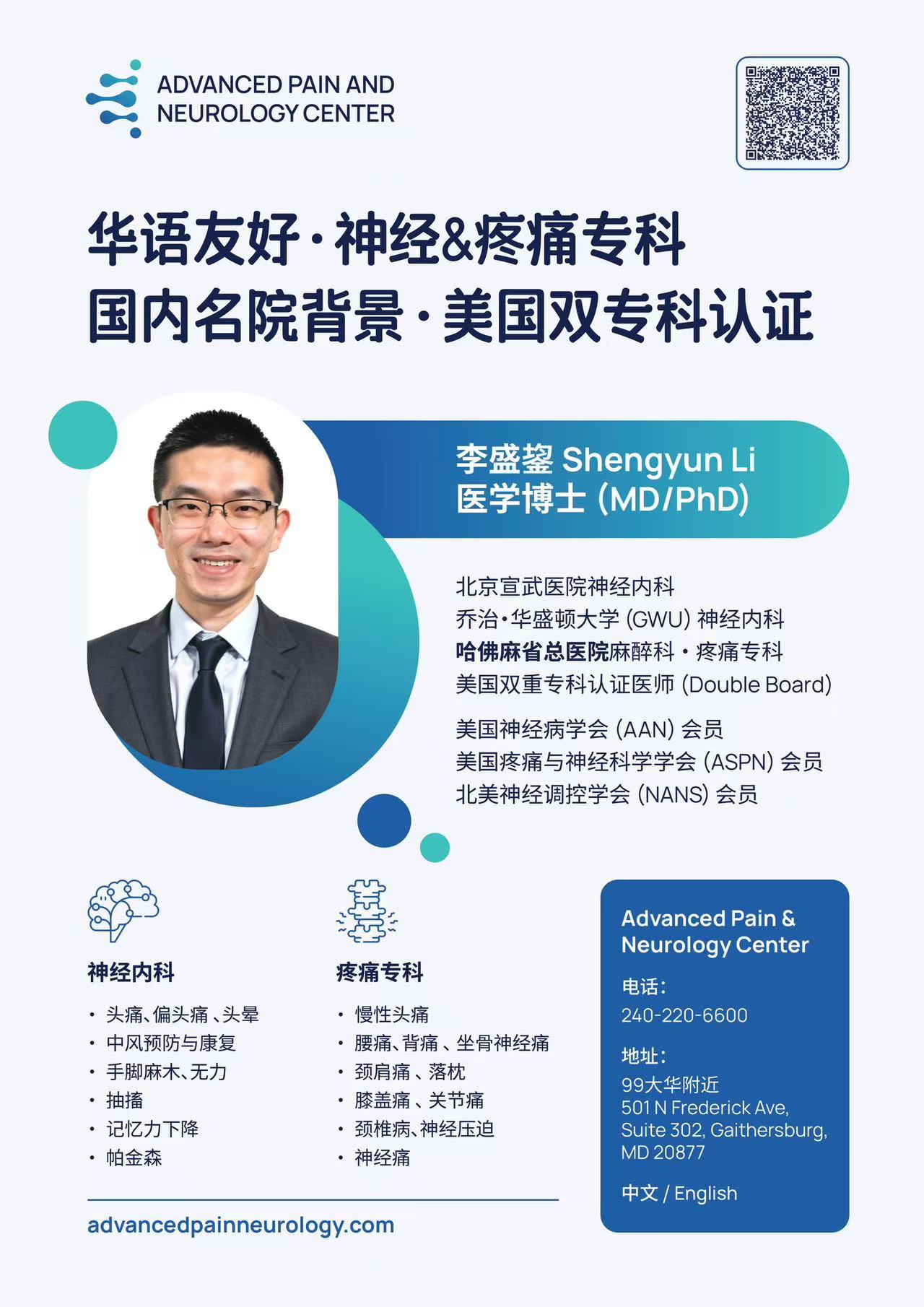 李医生拥有美国少有的神经内科与疼痛专科双重认证,出身于国内顶尖的北京宣武医院神经内科,并先后在乔治·华盛顿大学(GWU)神经内科、哈佛大学麻省总医院(MGH)疼痛专科接受系统训练,拥有跨中美临床体系的专业经验。