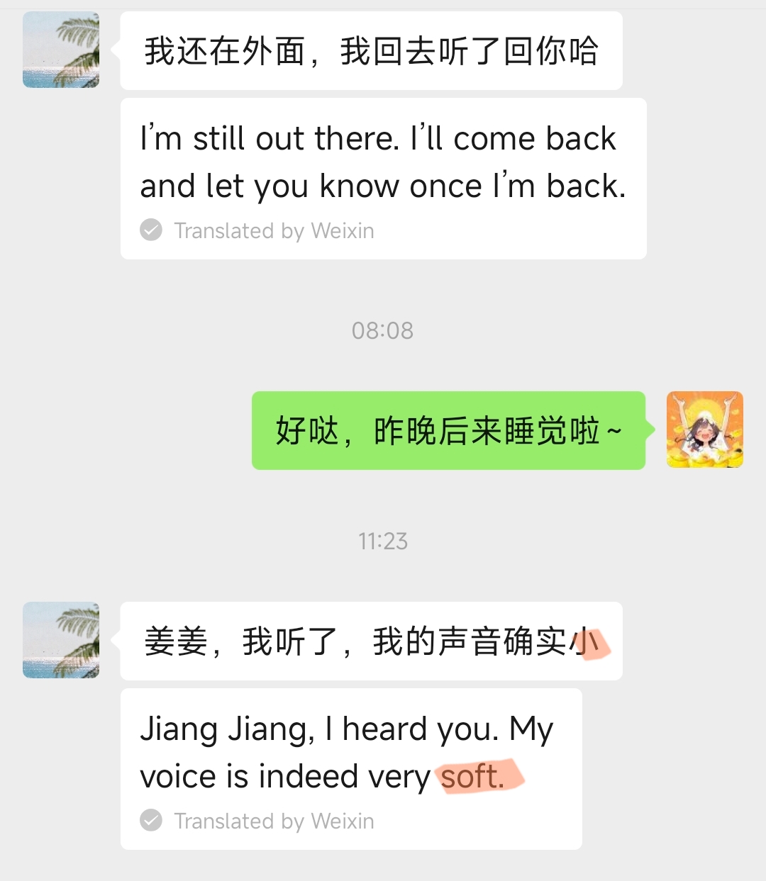 本期由于录制收音问题,部分片段声音较小,在商量要不要补录时,微信设置的自动翻译,小小地治愈了我一下,让我们欣然接受音频质量的不完美。