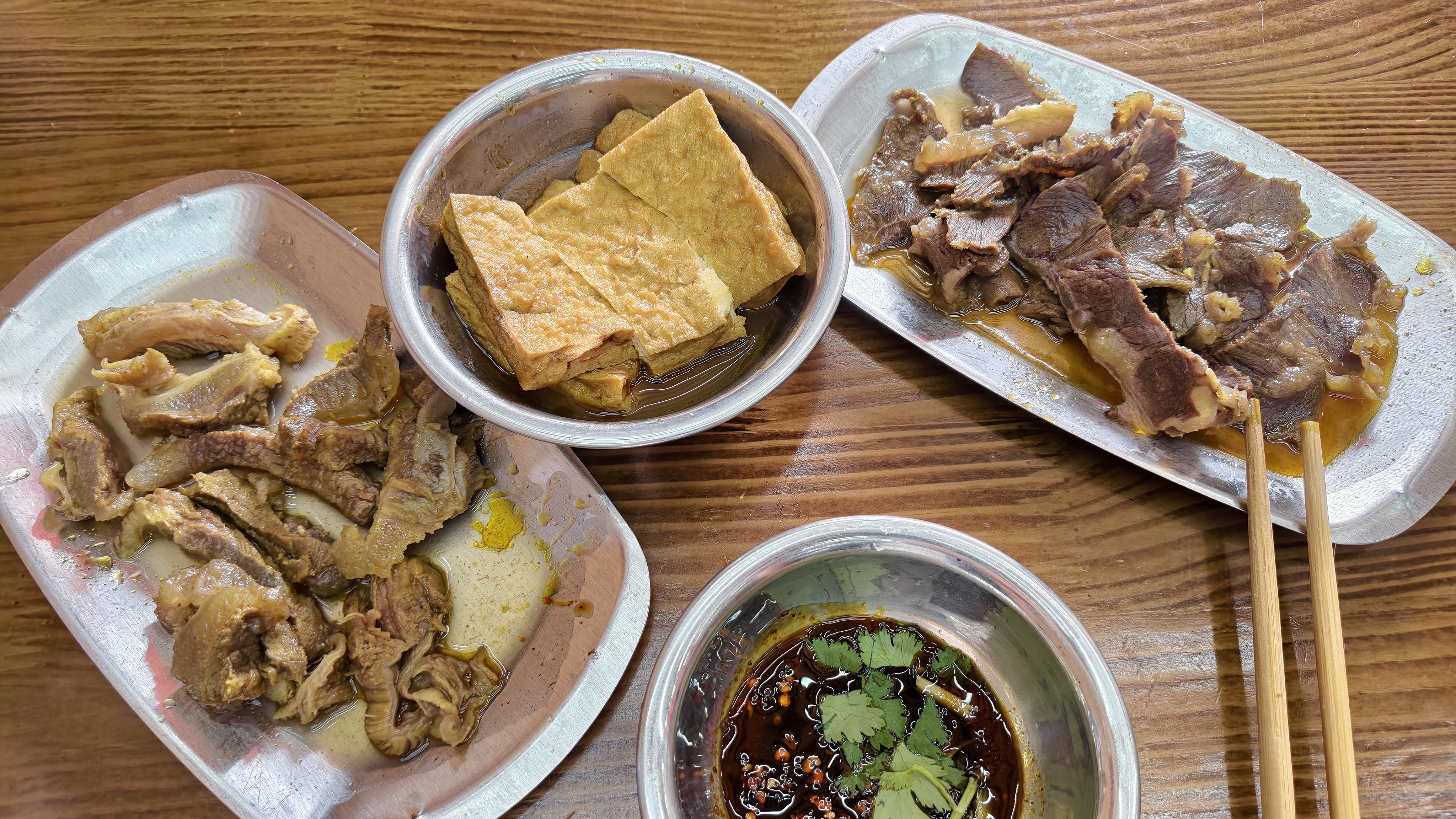 关岳庙对面路口老铺,牛肉汤估计加了某些中草药卤料成份。