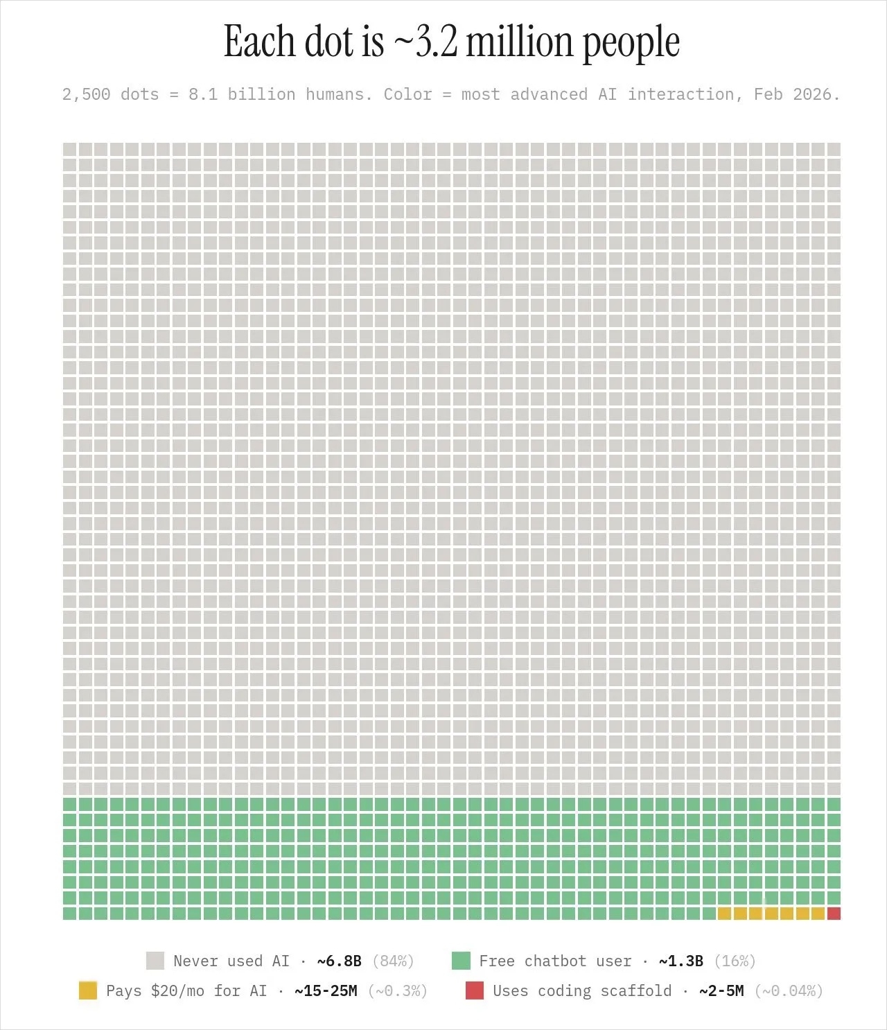 16% 用过免费的聊天机器人,就是底部那条绿色带。0.3%会为AI每月付20美元,就是那一小撮黄色。
