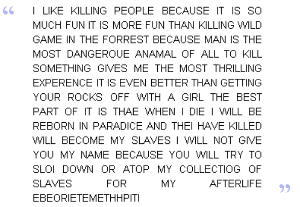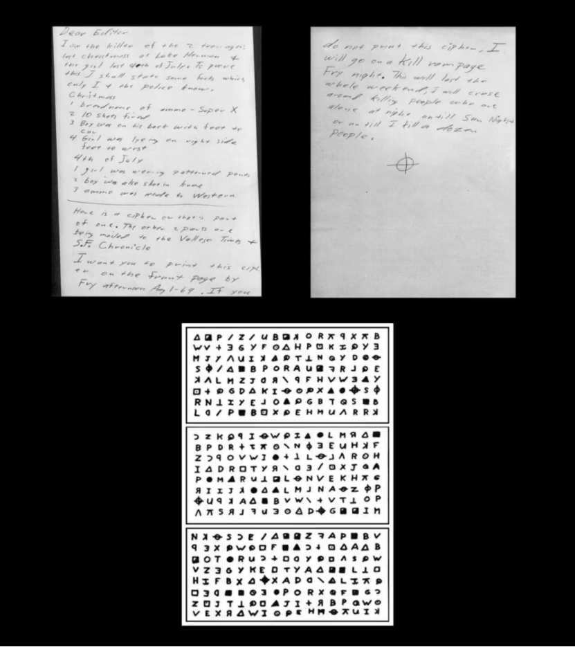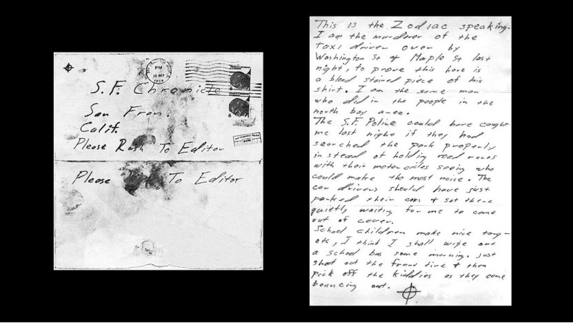 写给《旧金山观察家报》的信,邮戳日期为 1969 年 7 月 31 日。写信人威胁说,如果报纸不刊登这封密信,他就会再次杀人,密信中有这样的话:「我喜欢杀人,因为这太有趣了。」