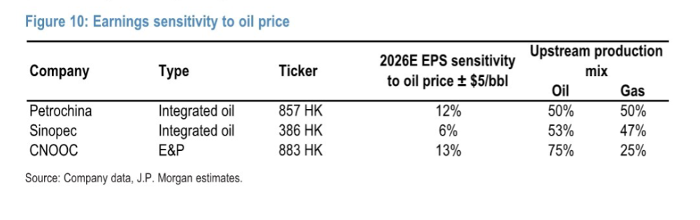 再看企业财务调整,图10(研报第8页)显示,中海油2026年EPS对油价敏感度最高,达13%,中石油12%,中石化仅6%,这解释了为何上游企业更受青睐。研报同时提到,中石油自2025年6月起持续囤气,2025年底天然气库存创纪录,有望在2026/27年气价谈判中占据优势。