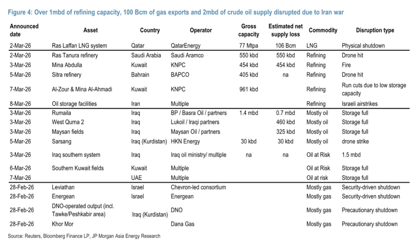 冲突是核心催化剂,图4(研报第4页)列出了伊朗战争导致的供应中断:卡塔尔LNG设施停产、沙特炼油厂遭无人机袭击、科威特因库存不足削减产量,累计影响超200万桶/日原油供应和1000亿立方米天然气出口,冲突持续时间预期已从“数日”拉长至“超1个月”。