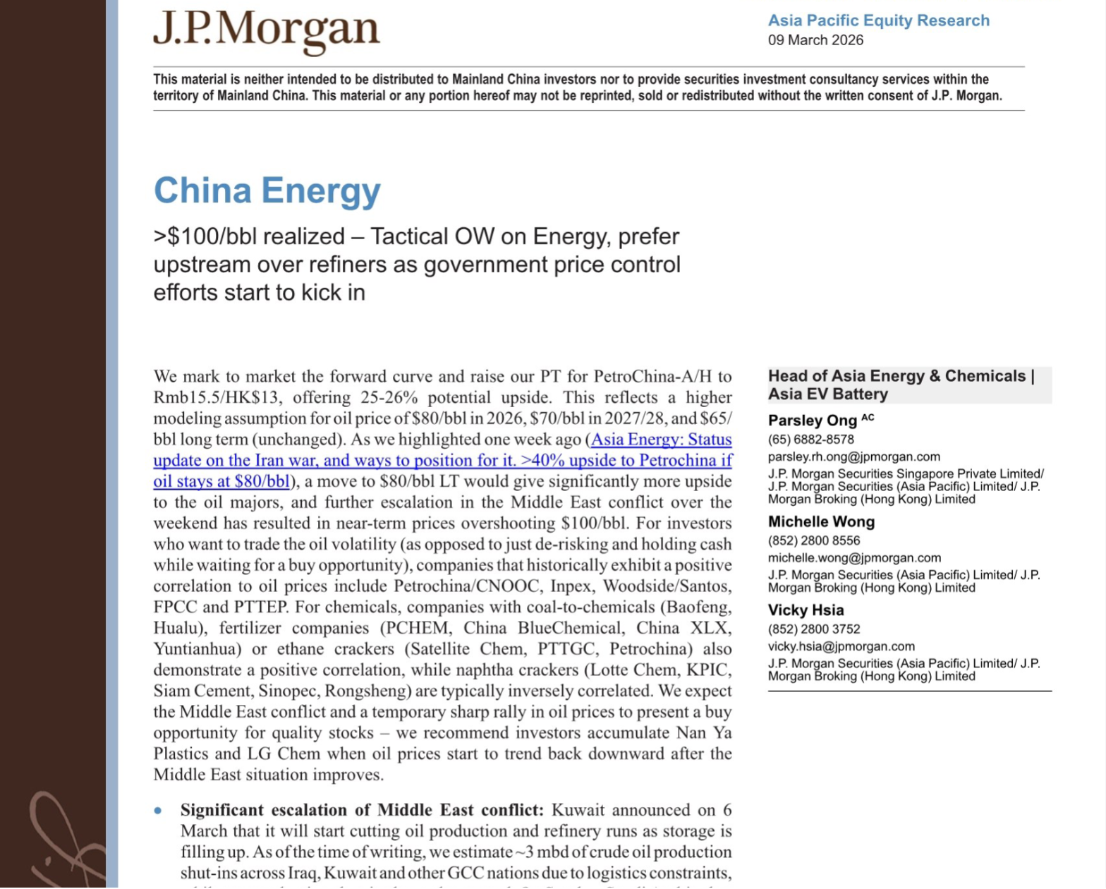 摩根大通3月9日发布的亚太区能源研报,核心结论直接给:战术性超配能源板块,上游企业比炼油厂更值得关注,国际油价短期已冲破100美元/桶,中石油A/H股还有25-26%上涨潜力。