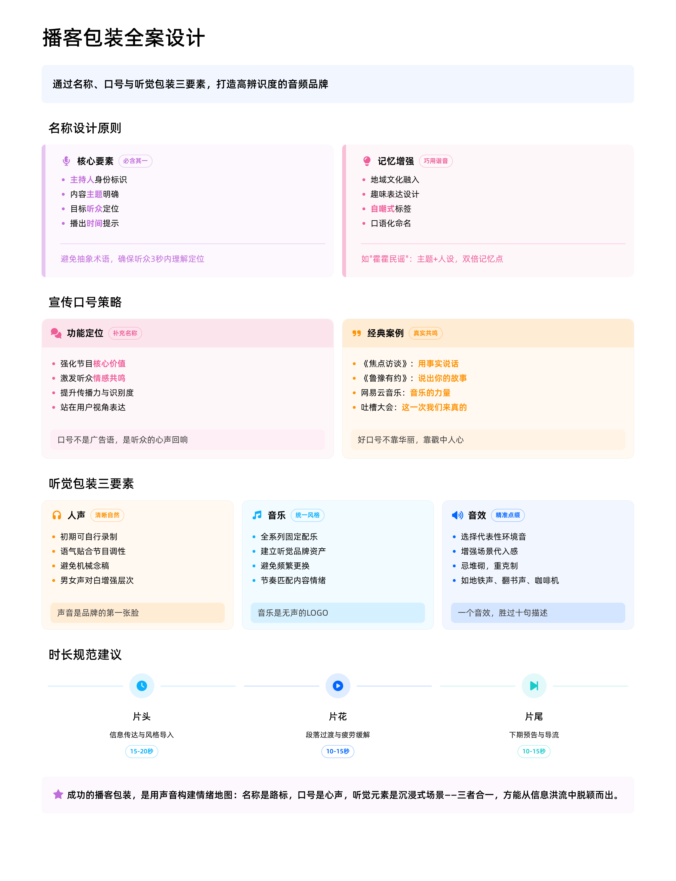 - 片头:互联网节目建议控制在15至20秒之间,兼顾信息传达与听众耐心。