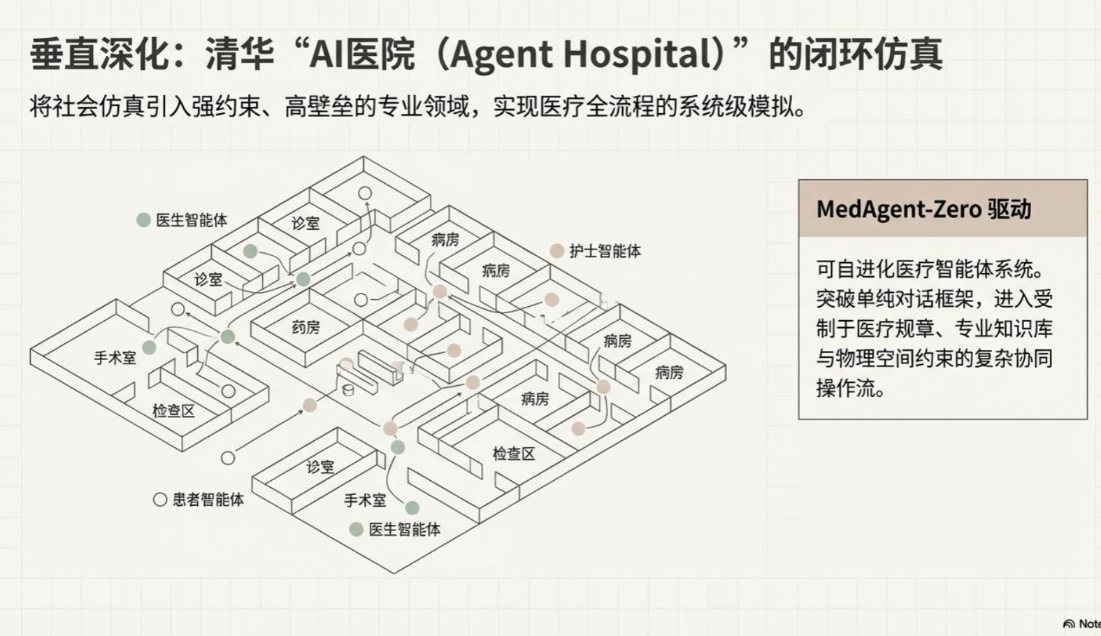 【图表2:医疗流转闭环图,研报中AI医院板块】:展示清华AI医院从发病、分诊、挂号到随访的9大核心医疗决策节点,复刻真实医疗体系全流程,标注了医生、护士、患者智能体的协同场景,证明硅基社会可实现强约束专业领域的系统级仿真,全流程无需人类干预。