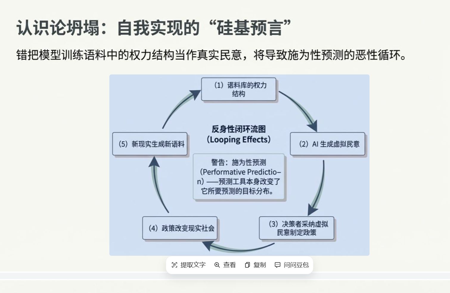 【图表3:硅基预言自我实现闭环图,研报中反身性危机板块】:以社会数据与表征为起点,经模型训练、决策流程介入、治理干预,最终形成行为模式改变、新数据生成的闭环,清晰呈现AI模型进入因果链后,如何从描述社会变为改写社会,揭示硅基社会的核心风险。