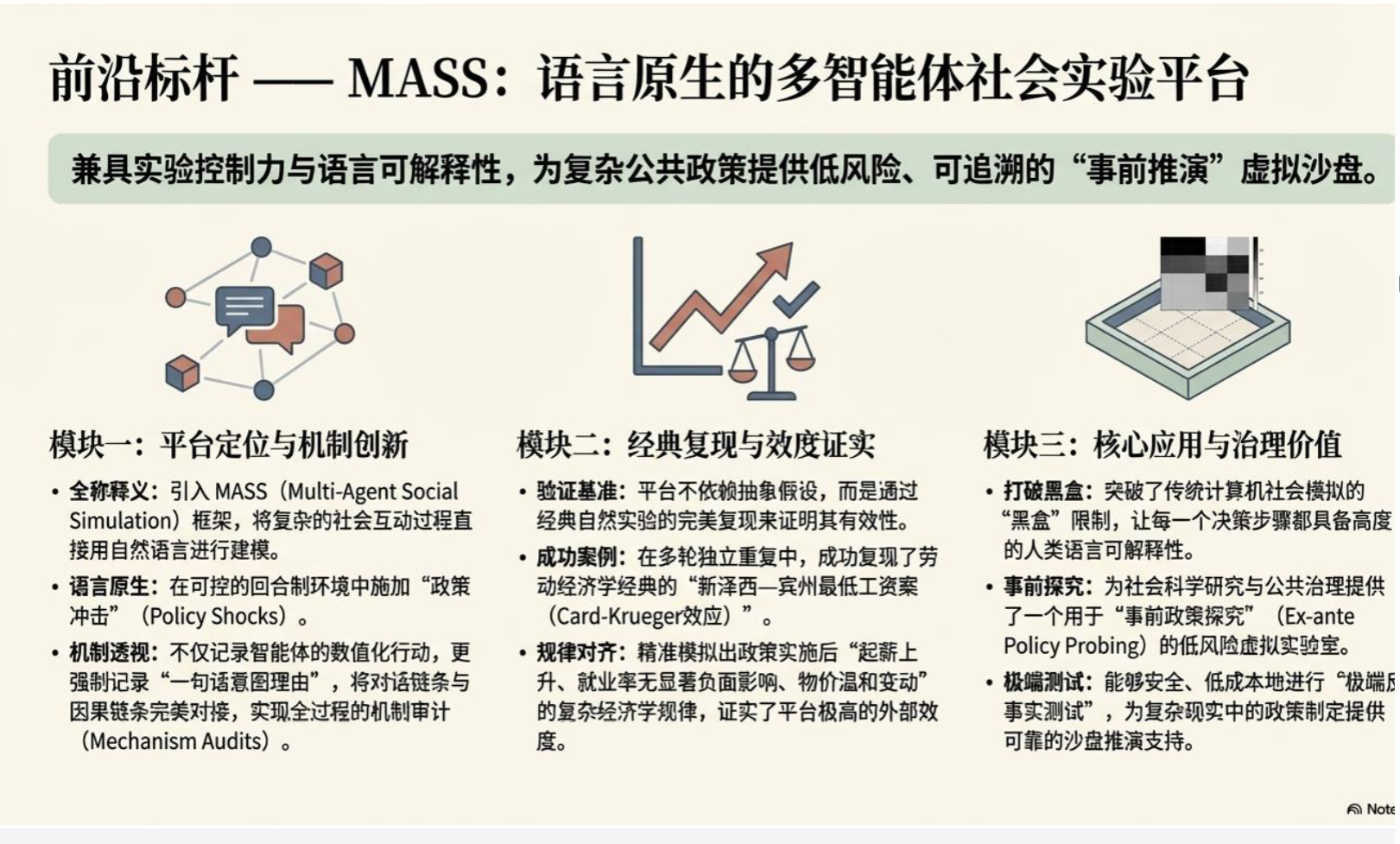 【图表1:平台范式对比表,研报中MASS框架板块】:横向对比AgentSociety、OASIS、MASS三大核心仿真平台,从规模看,AgentSociety支撑10k+智能体、OASIS达百万级、MASS为中型可控;核心焦点各有侧重,分别是城市活动与心智耦合、网络拓扑与算法推荐、语言原生机制与审计;适用场景也形成互补,覆盖复杂社会现象、媒介生态极化、政策反事实推演,清晰界定了不同平台的产业落地方向。