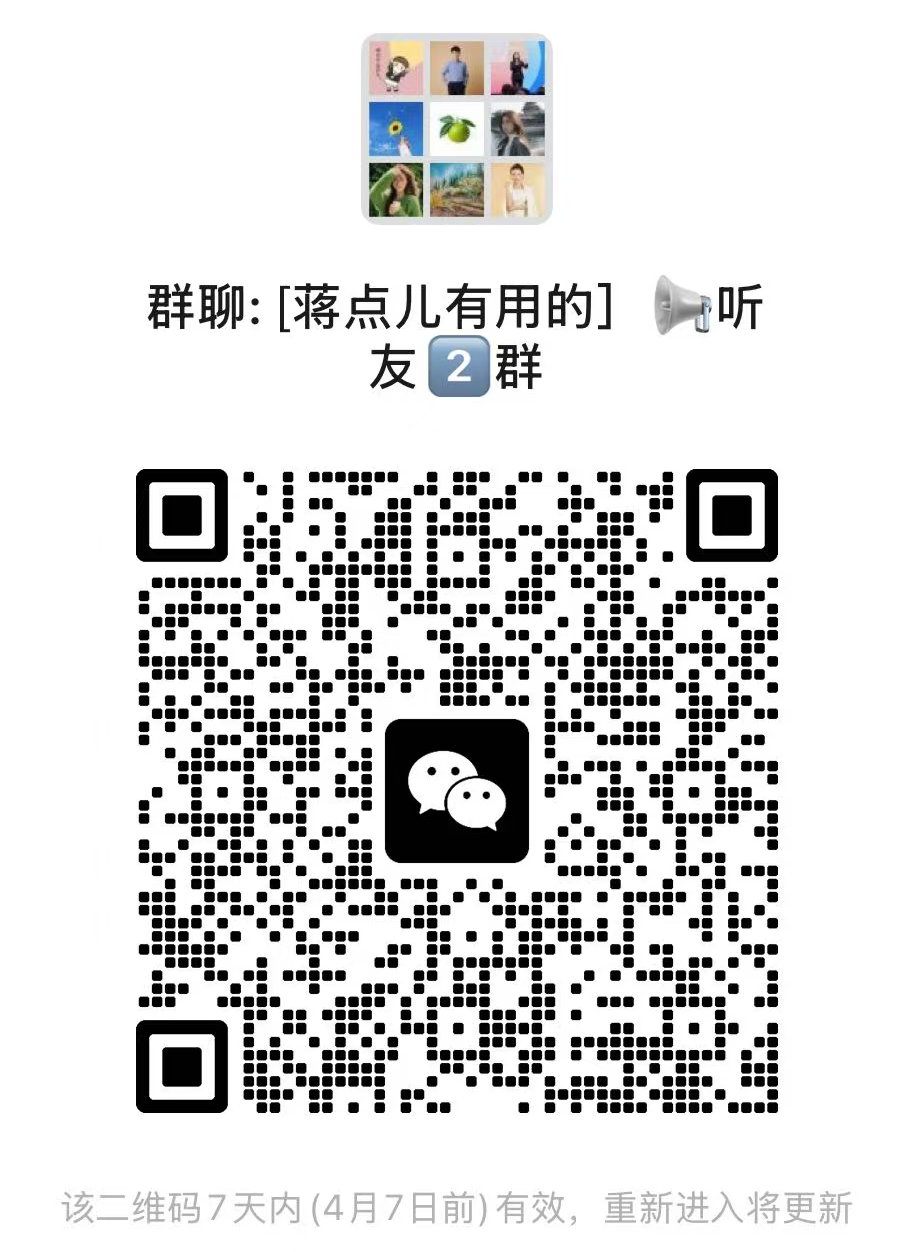 扫码进《蒋点儿有用的》听友群(群二维码在最底部,如果二维码过期,请评论区告诉我),或直接加助理微信:Stering_DZW,群内会有最新内容的提醒以及不定期的福利派发,如我的签名书等等,还可以更近距离与我链接。