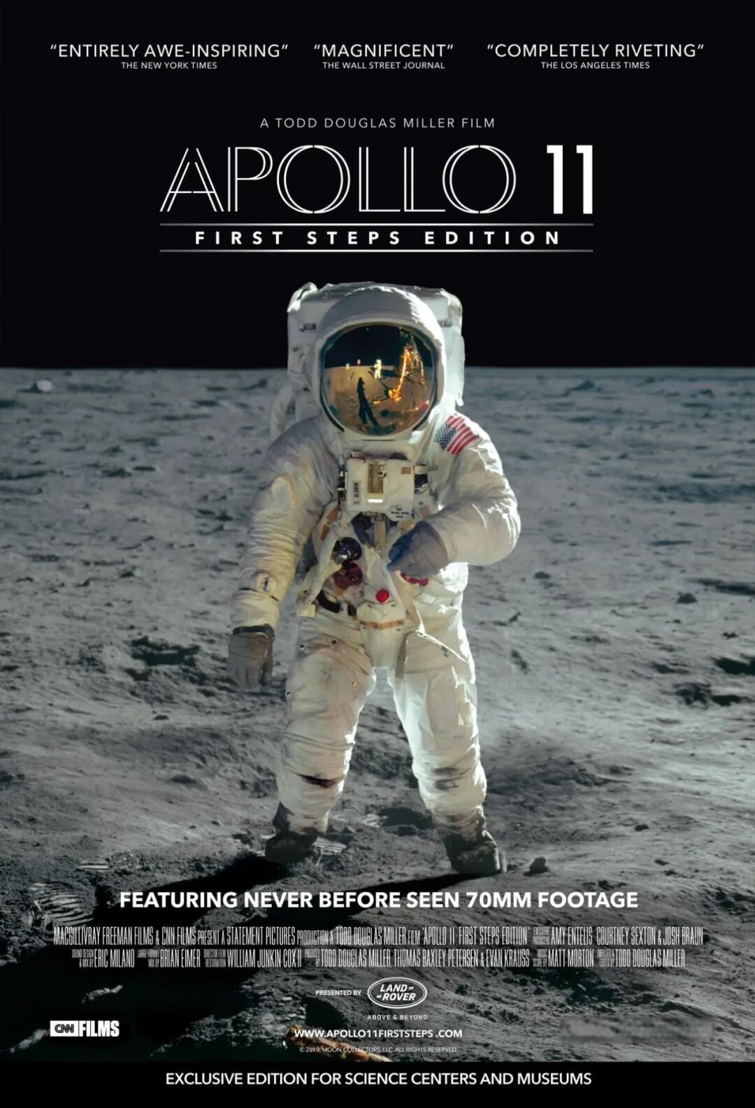 六个小时后,阿姆斯特朗爬出舱门,走下九级扶梯。当他的左脚触及月面时,他说:这是个人的一小步,却是人类的一大步。两人在月球上停留了二十一小时十八分钟,采集了二十三公斤岩石和土壤样本,留下了一块铭牌,上面写着:我们代表全人类,为和平而来。