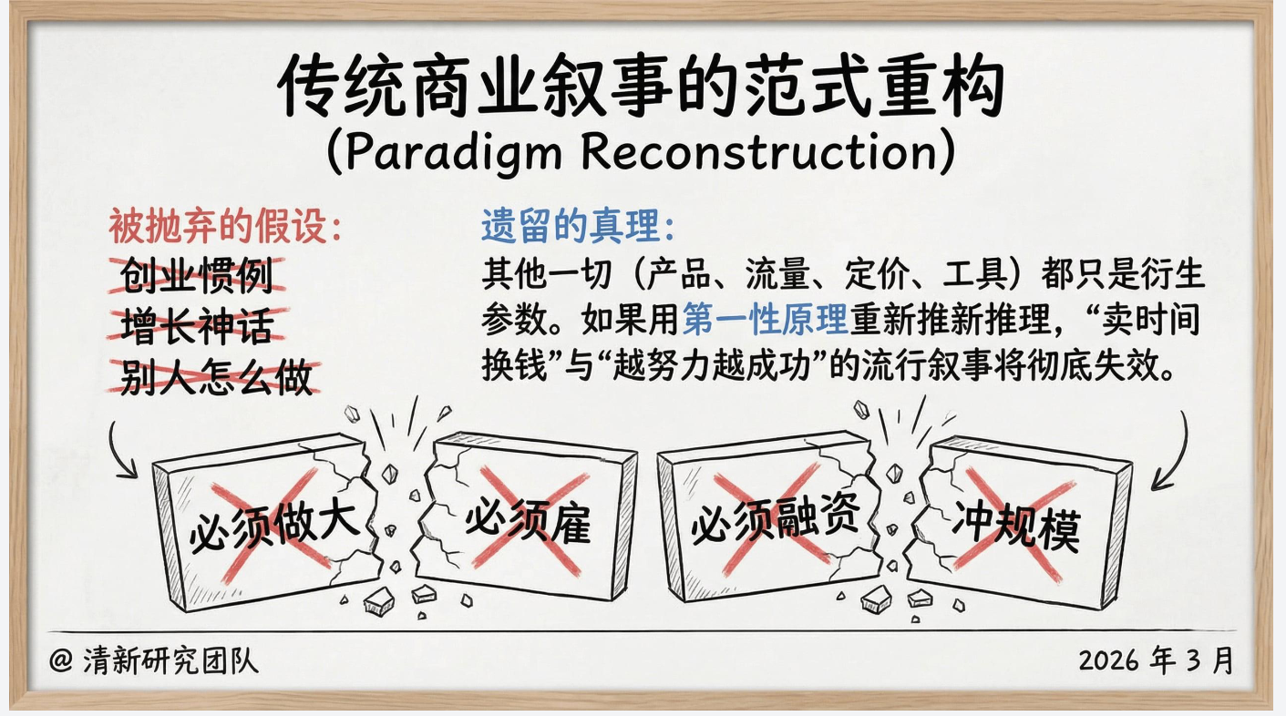 清新研究团队2026年3月发布的《一人公司发展研究报告2.0》,以AI赋能为核心视角,颠覆了传统商业的增长逻辑,提出个体凭借AI杠杆,可打造服务于人生主权的可持续商业系统,这是历史上首次个体拥有与大公司对等的生产力武器,一人公司的黄金时代已至。