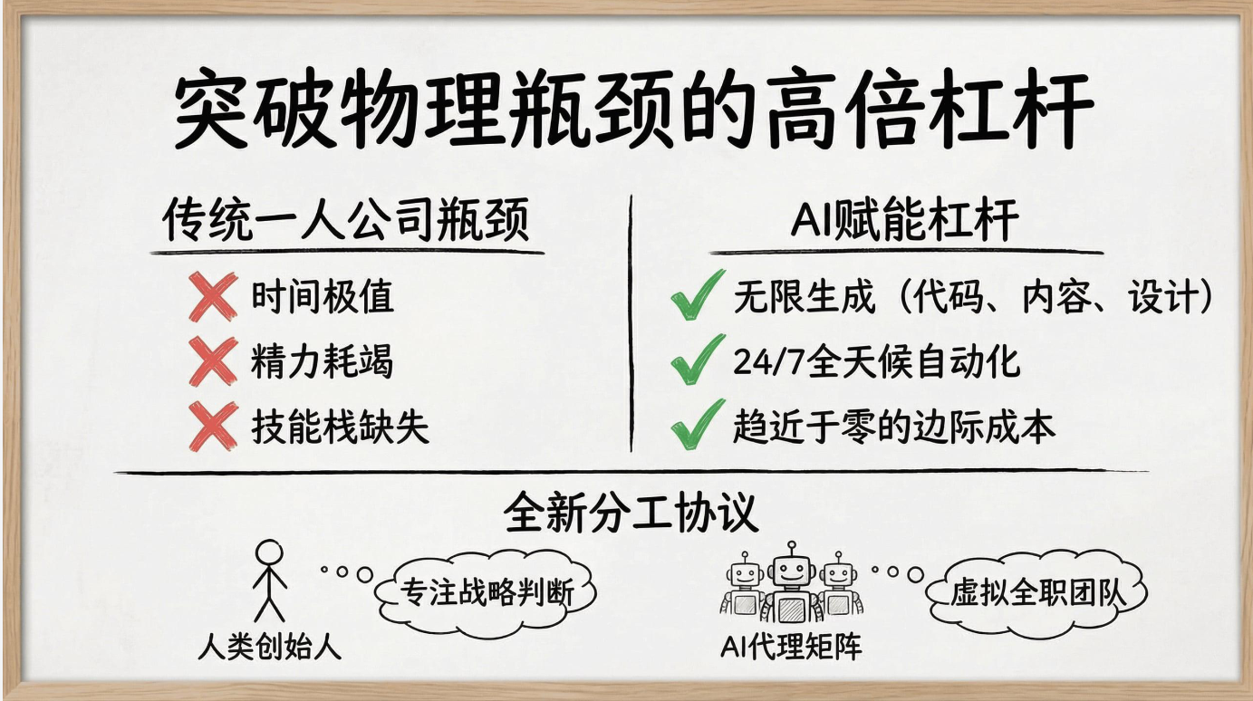 研报核心推翻了“必须做大、必须雇人、必须融资”的传统创业假设,提出五大核心真理,而个体是系统中唯一的稀缺资源,时间、精力等硬约束无法无限扩展,这也是一人公司构建的底层逻辑。商业的本质被回归为价值捕获的精简回路,无需庞大组织,仅需解决根本问题并完成价值获取,而一人公司的核心壁垒,在于通过产品化、自动化、数字资产实现极度杠杆化,这也是突破传统一人创业时间、精力瓶颈的关键。