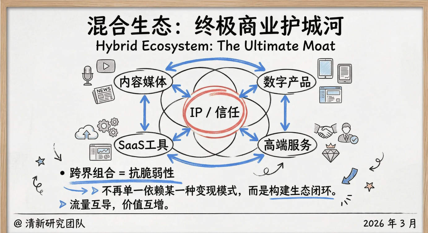 混合生态护城河图则指出,单一变现模式存在风险,融合内容媒体、数字产品、SaaS工具、高端服务的跨界生态,能实现流量互导、价值互增,这是一人公司的终极商业护城河。