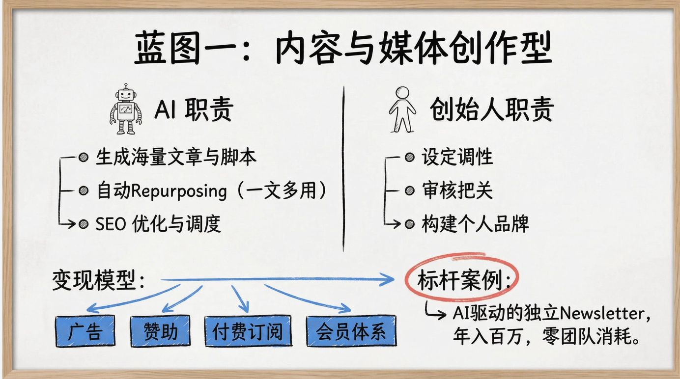 研报还给出了六大一人公司商业蓝图,六大商业蓝图能力分工图(研报第11-16页)详细划分了内容创作、数字产品、AI工具、专业咨询、电商运营、创意生产六大类型的AI与创始人职责,不同赛道均有明确的变现模型与标杆案例,比如AI驱动的独立Newsletter可实现零团队消耗的稳定收益,一人可借助AI管理50家跨境店铺实现全流程自动化。